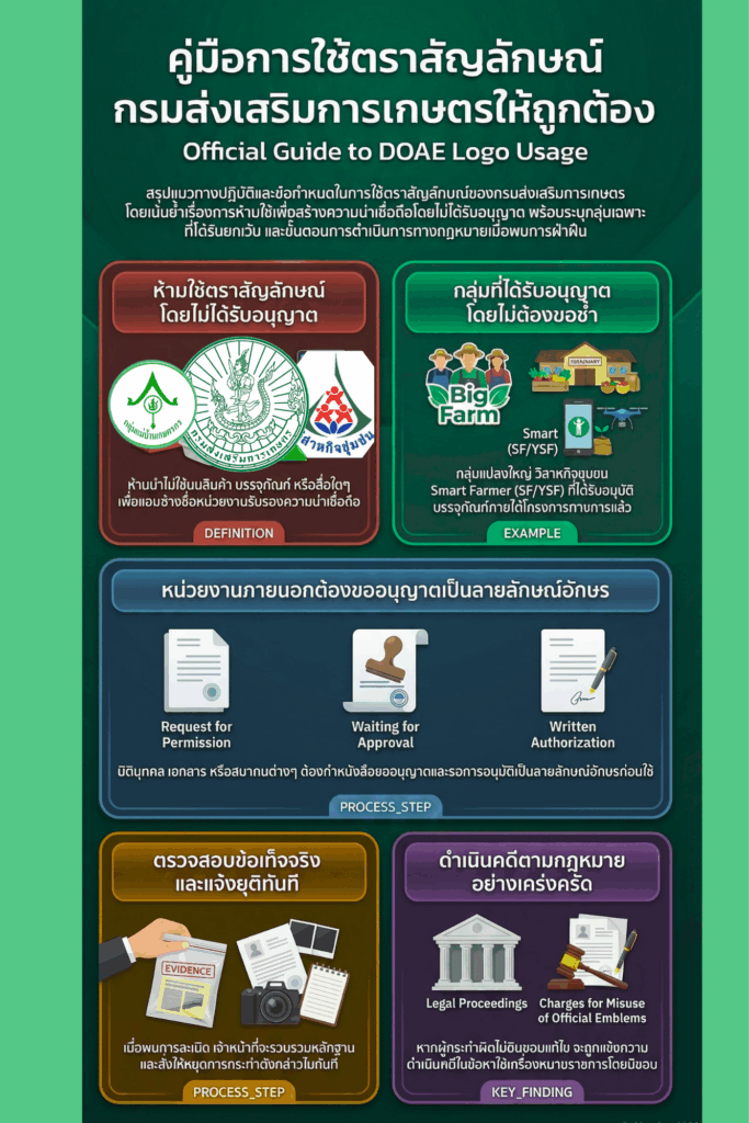 เพื่อให้เป็นแนวทางการป้องกันการแอบอ้างตราสัญลักษณ์ของกรมส่งเสริมการเกษตร โดยไม่ได้รับอนุญาติ ซึ่งจะนำไปสู่อันก่อให้เกิดความเข้าใจผิดแก่ประชาชนและส่งผลกระทบต่อภาพลักษณ์ของกรมส่งเสริมการเกษตร ซึ่งการกระทำดังกล่าวเข้าข่ายฝ่าฝืน พระราชบัญญัติเครื่องหมายราชการ พ.ศ. 2482