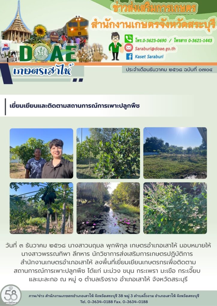 วันที่ 3 ธันวาคม 2568 นางสาวนฤมล พุกพิกุล เกษตรอำเภอเสาไห้ มอบหมายให้ นางสาวพรรณทิพา ลีทหาร นักวิชาการส่งเสริมการเกษตรปฏิบัติการ สำนักงานเกษตรอำเภอเสาไห้ ลงพื้นที่เยี่ยมเยียนเกษตรกรเพื่อติดตามสถานการณ์การเพาะปลูกพืช ได้แก่ มะม่วง ขนุน กระเพรา มะเขือ กระเจี๊ยบ และมะละกอ ณ หมู่ 1 ตำบลเริงราง อำเภอเสาไห้ จังหวัดสระบุรี