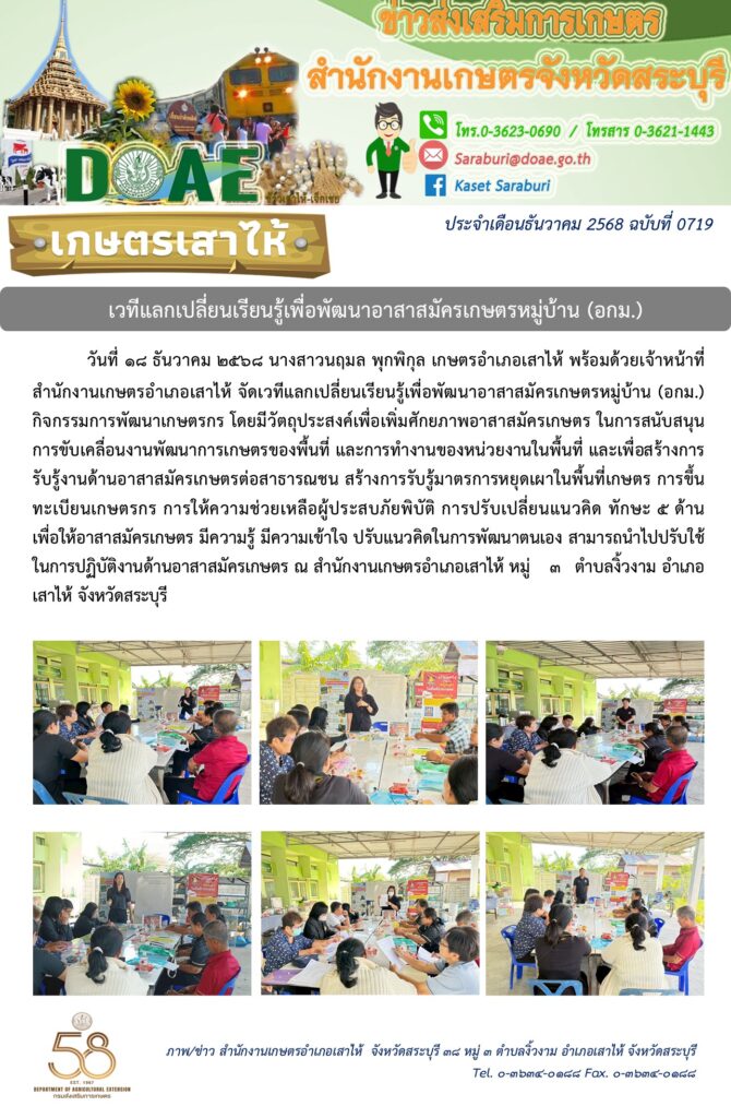 วันที่ 18 ธันวาคม 2568 นางสาวนฤมล พุกพิกุล เกษตรอำเภอเสาไห้ พร้อมด้วยเจ้าหน้าที่สำนักงานเกษตรอำเภอเสาไห้ จัดเวทีแลกเปลี่ยนเรียนรู้เพื่อพัฒนาอาสาสมัครเกษตรหมู่บ้าน (อกม.) กิจกรรมการพัฒนาเกษตรกร โดยมีวัตถุประสงค์เพื่อเพิ่มศักยภาพอาสาสมัครเกษตร โดยการสนับสนุนการขับเคลื่อนงานพัฒนาการเกษตรของพื้นที่ และการทำงานของหน่วยงานในพื้นที่ และเพื่อสร้างการรับรู้งานด้านอาสาสมัครเกษตรต่อสาธารณชน สร้างการรับรู้มาตรการหยุดเผาในพื้นที่เกษตร การขึ้นทะเบียนเกษตรกร การให้ความช่วยเหลือผู้ประสบภัยพิบัติ การปรับเปลี่ยนแนวคิด ทักษะ 5 ด้าน เพื่อให้อาสาสมัครเกษตร มีความรู้ มีความเข้าใจ ปรับแนวคิดในการพัฒนาตนเอง สามารถนำไปปรับใช้ในการปฏิบัติงานด้านอาสาสมัครเกษตร ณ สำนักงานเกษตรอำเภอเสาไห้ หมู่ 3 ตำบลงิ้วงาม อำเภอเสาไห้ จังหวัดสระบุรี