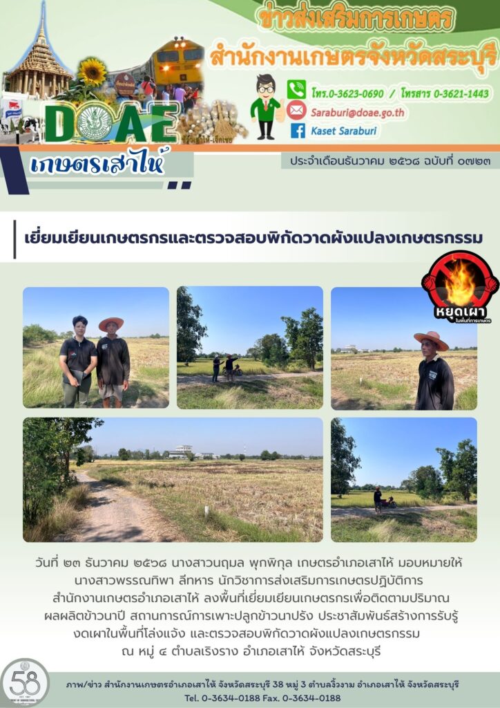 วันที่ 23 ธันวาคม 2568 นางสาวนฤมล พุกพิกุล เกษตรอำเภอเสาไห้ มอบหมายให้นางสาวพรรณทิพา ลีทหาร นักวิชาการส่งเสริมการเกษตรปฏิบัติการ สำนักงานเกษตรอำเภอเสาไห้ ลงพื้นที่เยี่ยมเยียนเกษตรกรเพื่อติดตามปริมาณผลผลิตข้าวนาปี สถานการณ์การเพาะปลูกข้าวนาปรัง ประชาสัมพันธ์สร้างการรับรู้งดเผาในพื้นที่โล่งแจ้ง และตรวจสอบพิกัดวาดผังแปลงเกษตรกรรม ณ หมู่ 4 ตำบลเริงราง อำเภอเสาไห้ จังหวัดสระบุรี