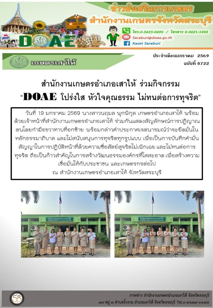 สำนักงานเกษตรอำเภอเสาไห้ ร่วมกิจกรรม “DOAE โปร่งใส หัวใจคุณธรรม ไม่ทนต่อการทุจริต”By สำนักงานเกษตรอำเภอเสาไห้ / 20/01/2026