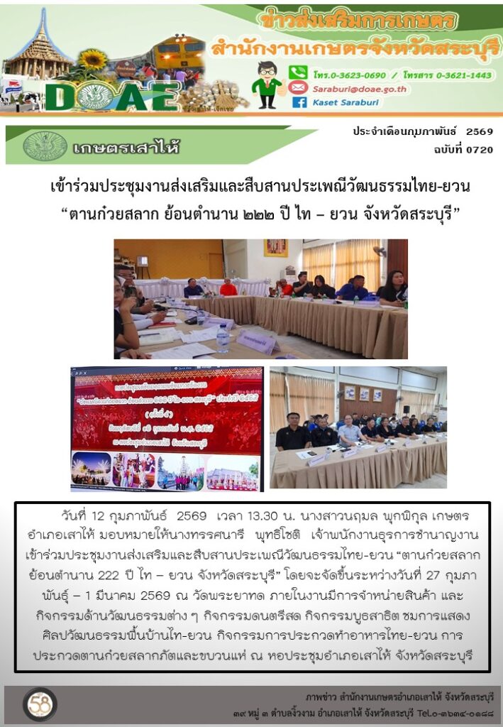 เข้าร่วมประชุมงานส่งเสริมและสืบสานประเพณีวัฒนธรรมไทย-ยวน “ตานก๋วยสลาก ย้อนตำนาน 222 ปี ไท – ยวน จังหวัดสระบุรี”By สำนักงานเกษตรอำเภอเสาไห้ / 12/02/2026
