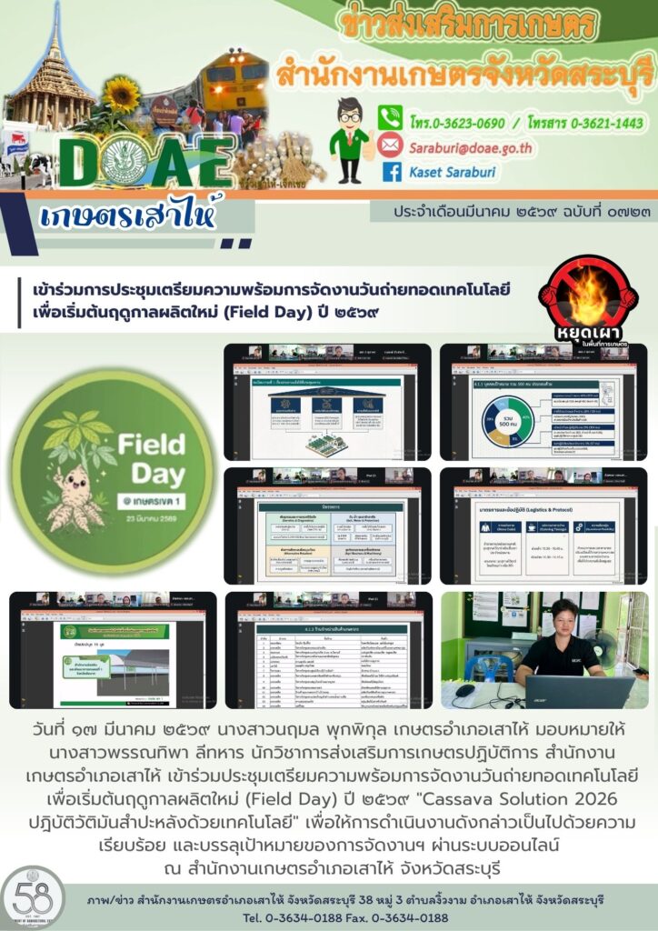 เข้าร่วมการประชุมเตรียมความพร้อมการจัดงานวันถ่ายทอดเทคโนโลยีเพื่อเริ่มต้นฤดูกาลผลิตใหม่ (Field Day) ปี ๒๕๖๙By สำนักงานเกษตรอำเภอเสาไห้ / 17/03/2026