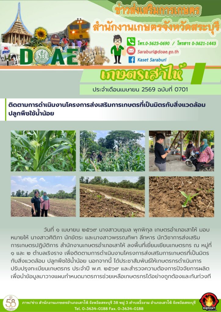 เยี่ยมเยียนเกษตรกรและติดตามสถานการณ์การเพาะปลูกพืชและติดตามโครงการส่งเสริมการเกษตรที่เป็นมิตรกับสิ่งแวดล้อม ปี ๒๕๖๙By สำนักงานเกษตรอำเภอเสาไห้ / 01/04/2026