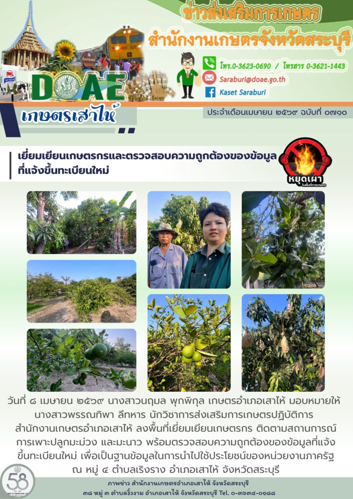 เยี่ยมเยียนเกษตรกรและตรวจสอบความถูกต้องของข้อมูลที่แจ้งขึ้นทะเบียนใหม่By สำนักงานเกษตรอำเภอเสาไห้ / 08/04/2026