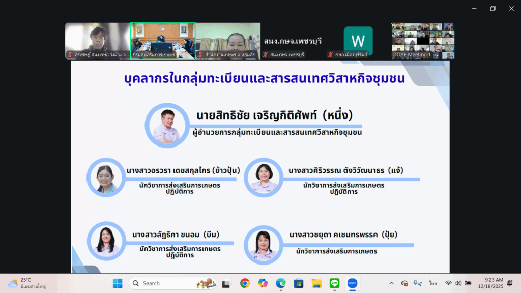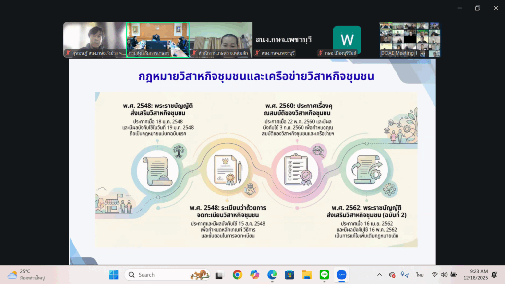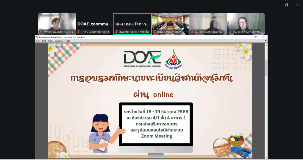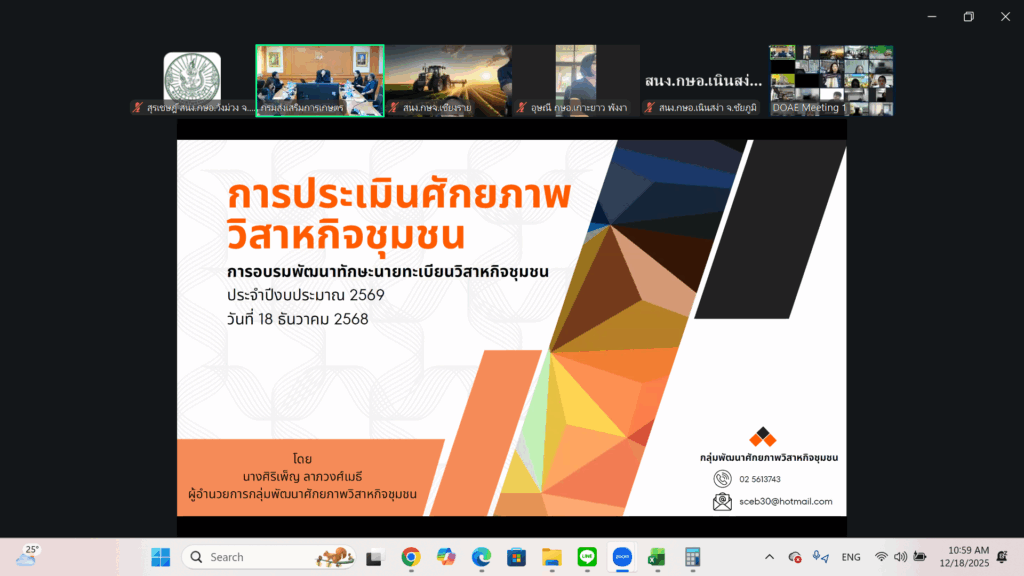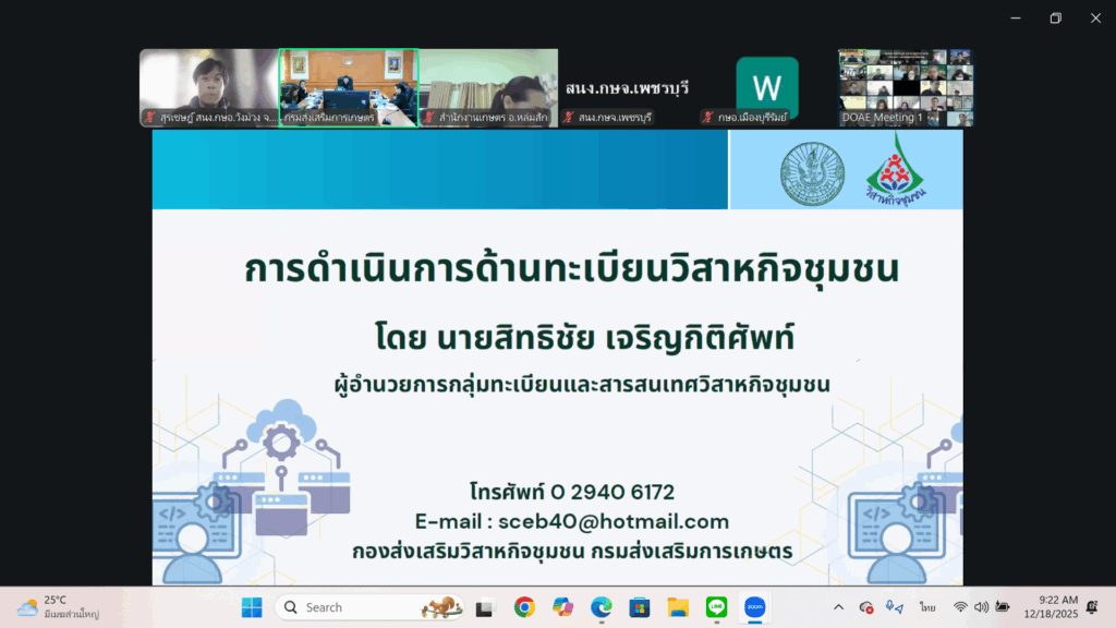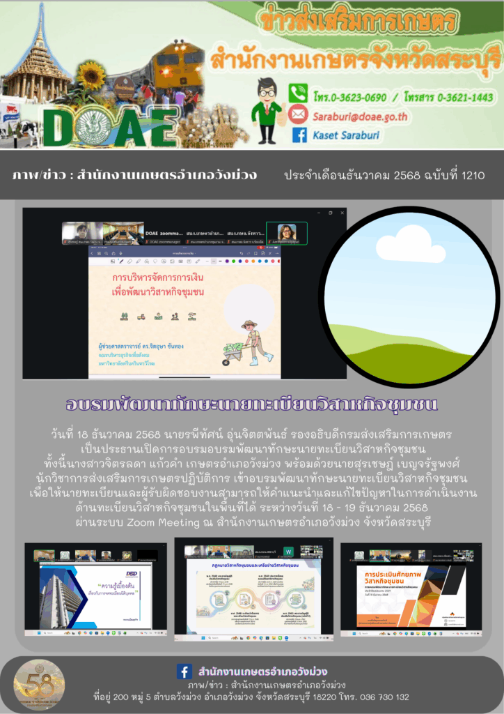 วันที่ 18 ธันวาคม 2568 นายรพีทัศน์ อุ่นจิตตพันธ์ รองอธิบดีกรมส่งเสริมการเกษตร เป็นประธานเปิดการอบรมอบรมพัฒนาทักษะนายทะเบียนวิสาหกิจชุมชน ทั้งนี้นางสาวจิตรลดา แก้วคำ เกษตรอำเภอวังม่วง พร้อมด้วยนายสุรเชษฎ์ เบญจรัฐพงศ์ นักวิชาการส่งเสริมการเกษตรปฏิบัติการ เข้าอบรมพัฒนาทักษะนายทะเบียนวิสาหกิจชุมชน เพื่อให้นายทะเบียนและผู้รับผิดชอบงานสามารถให้คำแนะนำและแก้ไขปัญหาในการดำเนินงานด้านทะเบียนวิสาหกิจชุมชนในพื้นที่ได้ ระหว่างวันที่ 18 – 19 ธันวาคม 2568 ผ่านระบบ Zoom Meeting ณ สำนักงานเกษตรอำเภอวังม่วง จังหวัดสระบุรี