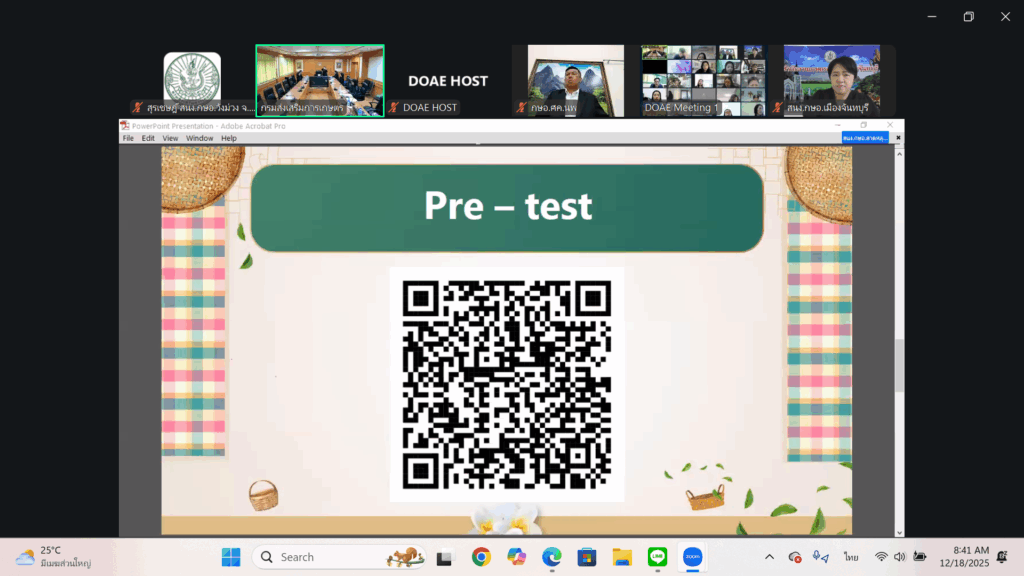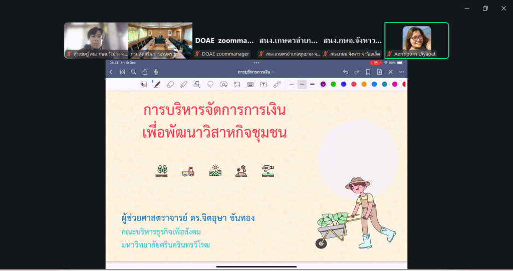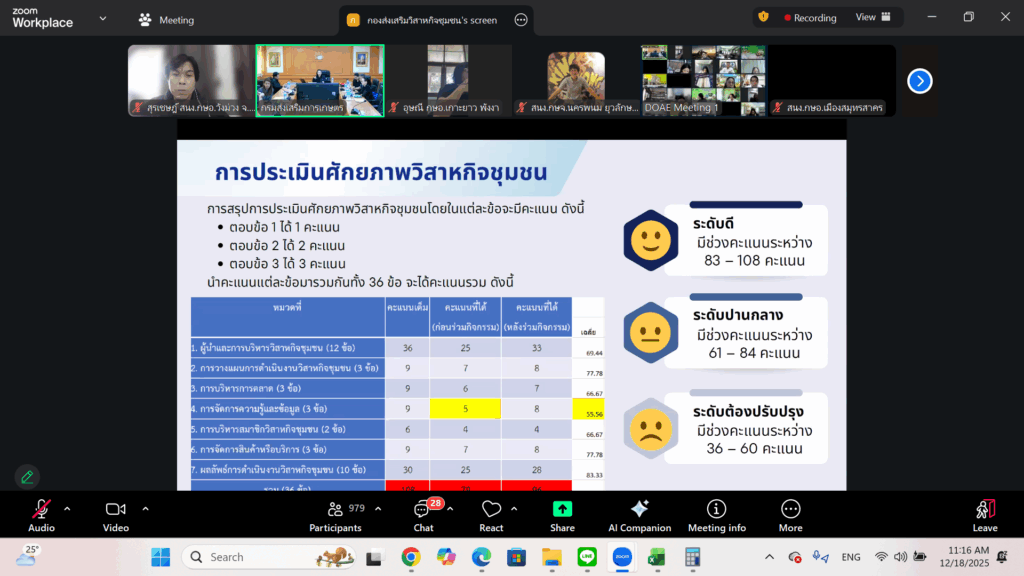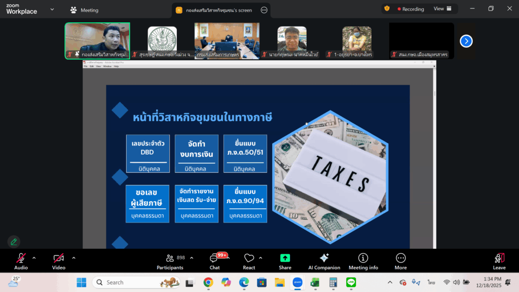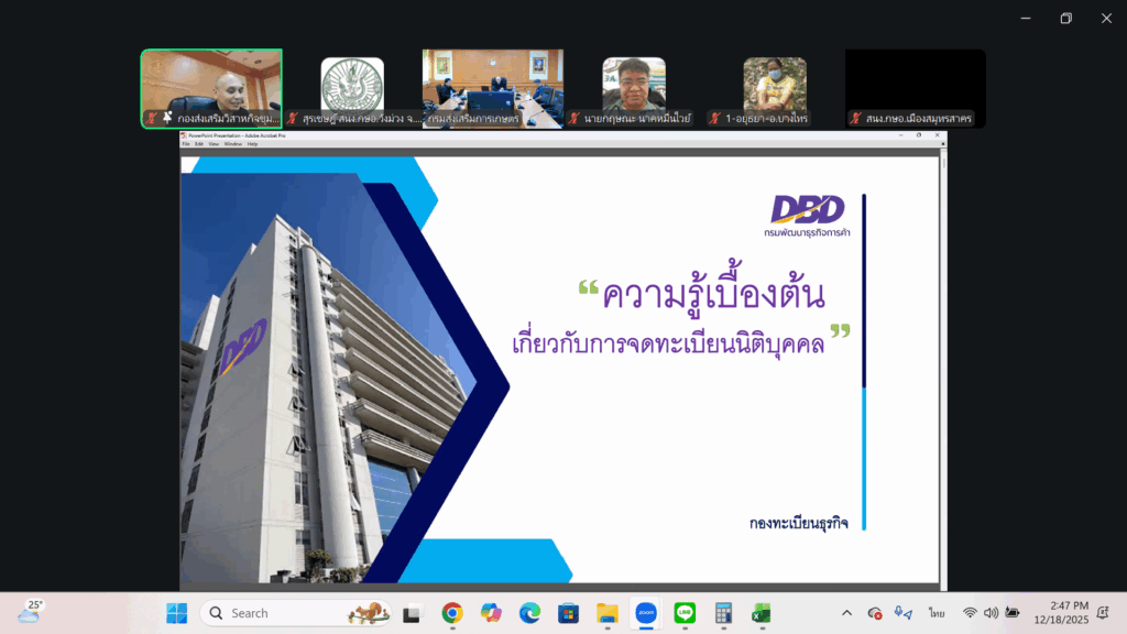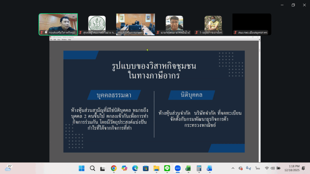 วันที่ 18 ธันวาคม 2568 นายรพีทัศน์ อุ่นจิตตพันธ์ รองอธิบดีกรมส่งเสริมการเกษตร เป็นประธานเปิดการอบรมอบรมพัฒนาทักษะนายทะเบียนวิสาหกิจชุมชน ทั้งนี้นางสาวจิตรลดา แก้วคำ เกษตรอำเภอวังม่วง พร้อมด้วยนายสุรเชษฎ์ เบญจรัฐพงศ์ นักวิชาการส่งเสริมการเกษตรปฏิบัติการ เข้าอบรมพัฒนาทักษะนายทะเบียนวิสาหกิจชุมชน เพื่อให้นายทะเบียนและผู้รับผิดชอบงานสามารถให้คำแนะนำและแก้ไขปัญหาในการดำเนินงานด้านทะเบียนวิสาหกิจชุมชนในพื้นที่ได้ ระหว่างวันที่ 18 – 19 ธันวาคม 2568 ผ่านระบบ Zoom Meeting ณ สำนักงานเกษตรอำเภอวังม่วง จังหวัดสระบุรี