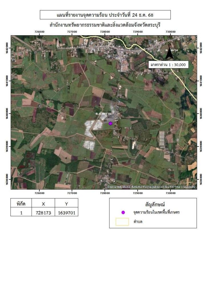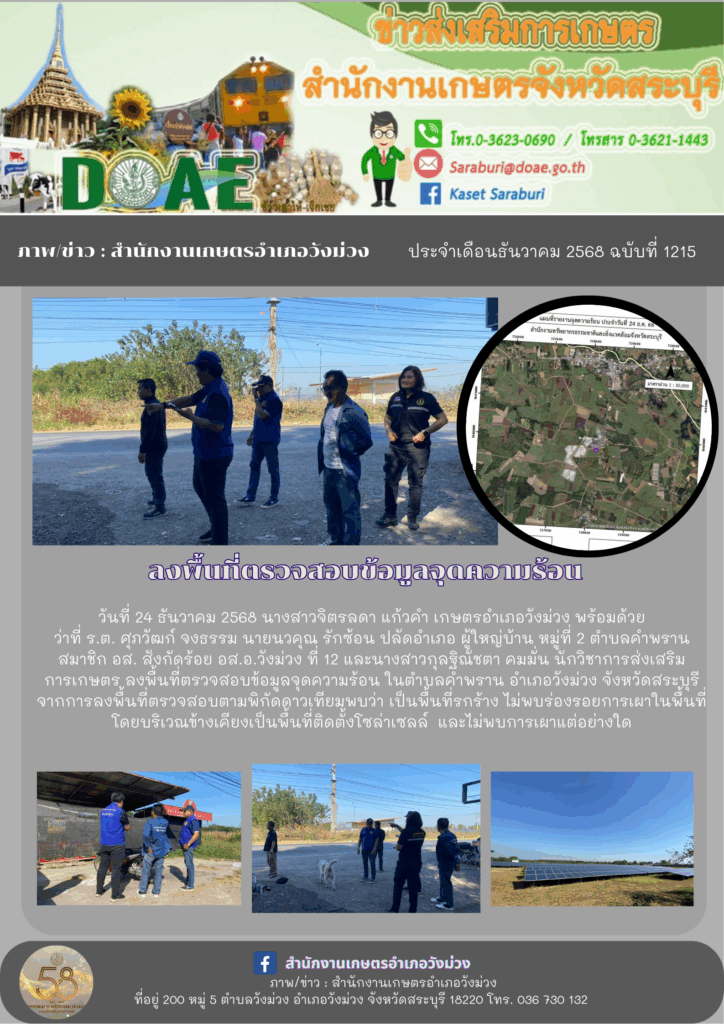 วันที่ 24 ธันวาคม 2568 นางสาวจิตรลดา แก้วคำ เกษตรอำเภอวังม่วง พร้อมด้วยว่าที่ ร.ต. ศุภวัฒก์ จงธรรม นายนวคุณ รักซ้อน ปลัดอำเภอ ผู้ใหญ่บ้าน หมู่ที่ 2 ตำบลคำพราน สมาชิก อส. สังกัดร้อย อส.อ.วังม่วง ที่ 12 และนางสาวกุลฐิณัชตา คมมั่น นักวิชาการส่งเสริมการเกษตร ลงพื้นที่ตรวจสอบข้อมูลจุดความร้อน ในตำบลคำพราน อำเภอวังม่วง จังหวัดสระบุรี จากการลงพื้นที่ตรวจสอบตามพิกัดดาวเทียมพบว่า เป็นพื้นที่รกร้าง ไม่พบร่องรอยการเผาในพื้นที่ โดยบริเวณข้างเคียงเป็นพื้นที่ติดตั้งโซล่าเซลล์ และไม่พบการเผาแต่อย่างใด