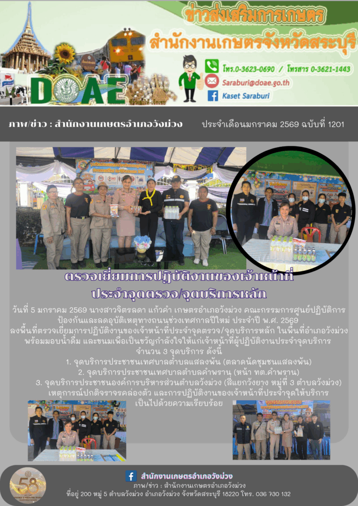 วันที่ 5 มกราคม 2569 นางสาวจิตรลดา แก้วคำ เกษตรอำเภอวังม่วง คณะกรรมการศูนย์ปฏิบัติการป้องกันและลดอุบัติเหตุทางถนนช่วงเทศกาลปีใหม่ ประจำปี พ.ศ. 2569 ลงพื้นที่ตรวจเยี่ยมการปฏิบัติงานของเจ้าหน้าที่ประจำจุดตรวจ/จุดบริการหลัก ในพื้นที่อำเภอวังม่วง พร้อมมอบน้ำดื่ม และขนมเพื่อเป็นขวัญกำลังใจให้แก่เจ้าหน้าที่ผู้ปฏิบัติงานประจำจุดบริการ จำนวน 3 จุดบริการ ดังนี้ 1. จุดบริการประชาชนเทศบาลตำบลแสลงพัน (ตลาดนัดชุมชนแสลงพัน), 2. จุดบริการประชาชนเทศบาลตำบลคำพราน (หน้า ทต.คำพราน), 3. จุดบริการประชาชนองค์การบริหารส่วนตำบลวังม่วง (สี่แยกวังยาง หมู่ที่ 3 ตำบลวังม่วง)เหตุการณ์ปกติจราจรคล่องตัว และการปฏิบัติงานของเจ้าหน้าที่ประจำจุดให้บริการเป็นไปด้วยความเรียบร้อย