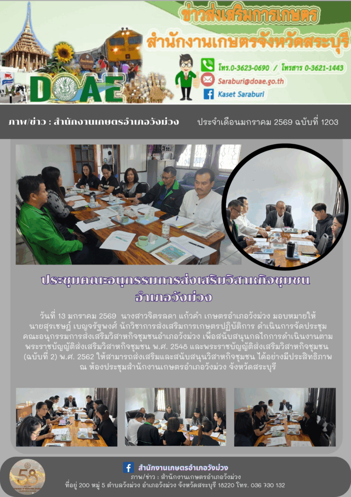 วันที่ 13 มกราคม 2569 นางสาวจิตรลดา แก้วคำ เกษตรอำเภอวังม่วง มอบหมายให้นายสุรเชษฎ์ เบญจรัฐพงศ์ นักวิชาการส่งเสริมการเกษตรปฏิบัติการ ดำเนินการจัดประชุมคณะอนุกรรมการส่งเสริมวิสาหกิจชุมชนอำเภอวังม่วง เพื่อสนับสนุนกลไกการดำเนินงานตามพระราชบัญญัติส่งเสริมวิสาหกิจชุมชน พ.ศ. 2548 และพระราชบัญญัติส่งเสริมวิสาหกิจชุมชน (ฉบับที่ 2) พ.ศ. 2562 ให้สามารถส่งเสริมและสนับสนุนวิสาหกิจชุมชน ได้อย่างมีประสิทธิภาพ ณ ห้องประชุมสำนักงานเกษตรอำเภอวังม่วง จังหวัดสระบุรี
