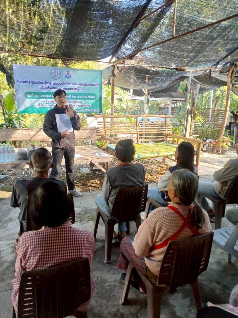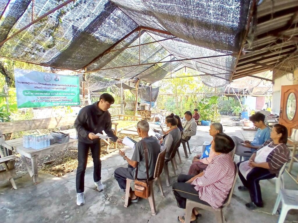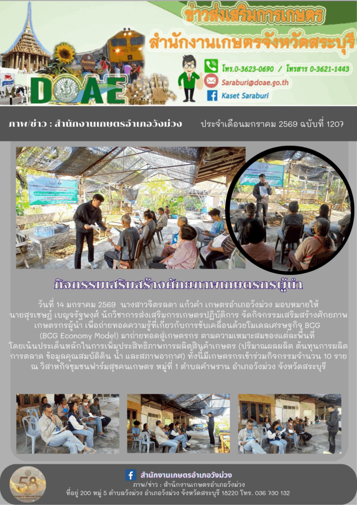 วันที่ 14 มกราคม 2569 นางสาวจิตรลดา แก้วคำ เกษตรอำเภอวังม่วง มอบหมายให้นายสุรเชษฎ์ เบญจรัฐพงศ์ นักวิชาการส่งเสริมการเกษตรปฏิบัติการ จัดกิจกรรมเสริมสร้างศักยภาพเกษตรกรผู้นำ เพื่อถ่ายทอดความรู้ที่เกี่ยวกับการขับเคลื่อนด้วยโมเดลเศรษฐกิจ BCG (BCG Economy Model) มาถ่ายทอดสู่เกษตรกร ตามความเหมาะสมของแต่ละพื้นที่ โดยเน้นประเด็นหลักในการเพิ่มประสิทธิภาพการผลิตสินค้าเกษตร (ปริมาณผลผลิต ต้นทุนการผลิต การตลาด ข้อมูลคุณสมบัติดิน น้ำ และสภาพอากาศ) ทั้งนี้มีเกษตรกรเข้าร่วมกิจกรรมจำนวน 10 ราย ณ วิสาหกิจชุมชนฟาร์มสุขคนเกษตร หมู่ที่ 1 ตำบลคำพราน อำเภอวังม่วง จังหวัดสระบุรี