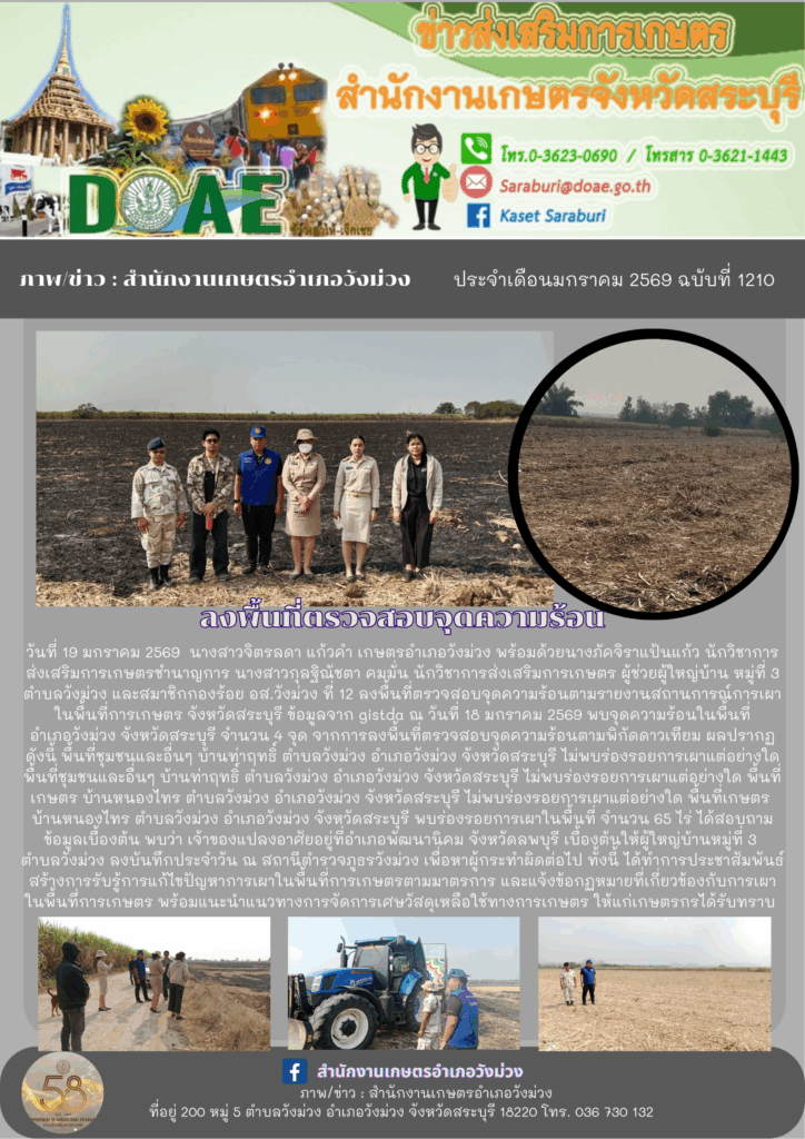 วันที่ 19 มกราคม 2569 นางสาวจิตรลดา แก้วคำ เกษตรอำเภอวังม่วง พร้อมด้วยนางภัคจิราแป้นแก้ว นักวิชาการส่งเสริมการเกษตรชำนาญการ นางสาวกุลฐิณัชตา คมมั่น นักวิชาการส่งเสริมการเกษตร ผู้ช่วยผู้ใหญ่บ้าน หมู่ที่ 3 ตำบลวังม่วง และสมาชิกกองร้อย อส.วังม่วง ที่ 12 ลงพื้นที่ตรวจสอบจุดความร้อนตามรายงานสถานการณ์การเผาในพื้นที่การเกษตร จังหวัดสระบุรี ข้อมูลจาก gistda ณ วันที่ 18 มกราคม 2569 พบจุดความร้อนในพื้นที่อำเภอวังม่วง จังหวัดสระบุรี จำนวน 4 จุด จากการลงพื้นที่ตรวจสอบจุดความร้อนตามพิกัดดาวเทียม ผลปรากฏ ดังนี้ พื้นที่ชุมชนและอื่นๆ บ้านท่าฤทธิ์ ตำบลวังม่วง อำเภอวังม่วง จังหวัดสระบุรี ไม่พบร่องรอยการเผาแต่อย่างใด พื้นที่ชุมชนและอื่นๆ บ้านท่าฤทธิ์ ตำบลวังม่วง อำเภอวังม่วง จังหวัดสระบุรี ไม่พบร่องรอยการเผาแต่อย่างใด พื้นที่เกษตร บ้านหนองไทร ตำบลวังม่วง อำเภอวังม่วง จังหวัดสระบุรี ไม่พบร่องรอยการเผาแต่อย่างใด พื้นที่เกษตร บ้านหนองไทร ตำบลวังม่วง อำเภอวังม่วง จังหวัดสระบุรี พบร่องรอยการเผาในพื้นที่ จำนวน 65 ไร่ ได้สอบถามข้อมูลเบื้องต้น พบว่า เจ้าของแปลงอาศัยอยู่ที่อำเภอพัฒนานิคม จังหวัดลพบุรี เบื้องต้นให้ผู้ใหญ่บ้านหมู่ที่ 3 ตำบลวังม่วง ลงบันทึกประจำวัน ณ สถานีตำรวจภูธรวังม่วง เพื่อหาผู้กระทำผิดต่อไป ทั้งนี้ ได้ทำการประชาสัมพันธ์สร้างการรับรู้การแก้ไขปัญหาการเผาในพื้นที่การเกษตรตามมาตรการ และแจ้งข้อกฏหมายที่เกี่ยวข้องกับการเผาในพื้นทึ่การเกษตร พร้อมแนะนำแนวทางการจัดการเศษวัสดุเหลือใช้ทางการเกษตร ให้แก่เกษตรกรได้รับทราบ