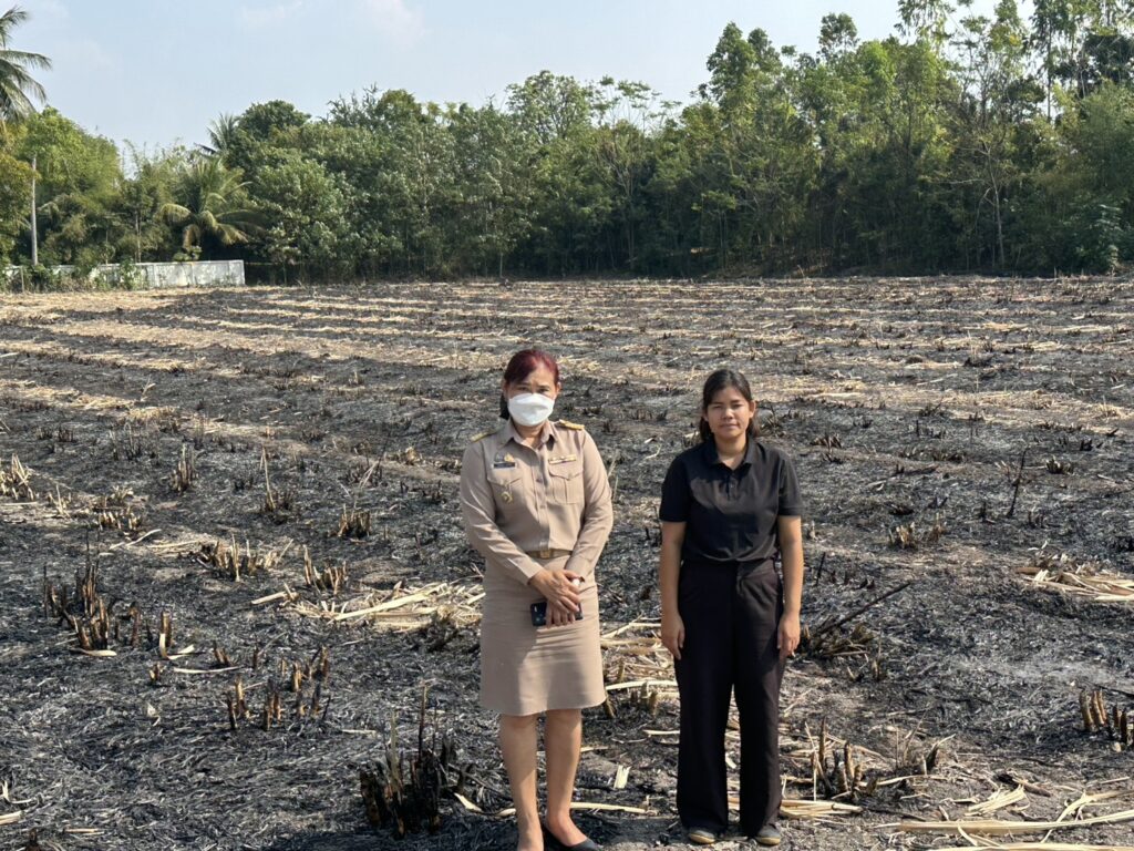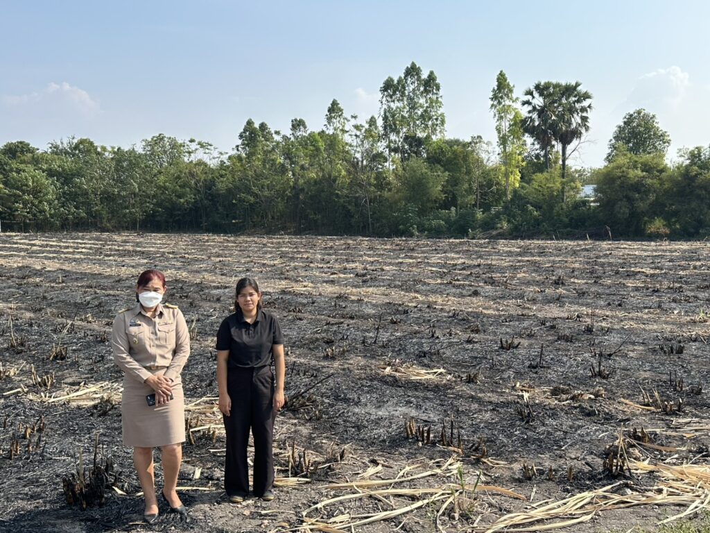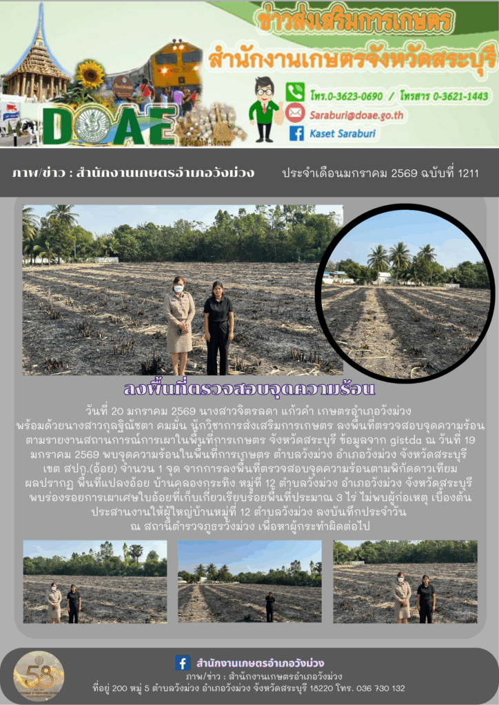 วันที่ 20 มกราคม 2569 นางสาวจิตรลดา แก้วคำ เกษตรอำเภอวังม่วง พร้อมด้วยนางสาวกุลฐิณัชตา คมมั่น นักวิชาการส่งเสริมการเกษตร ลงพื้นที่ตรวจสอบจุดความร้อนตามรายงานสถานการณ์การเผาในพื้นที่การเกษตร จังหวัดสระบุรี ข้อมูลจาก gistda ณ วันที่ 19 มกราคม 2569 พบจุดความร้อนใoพื้นที่การเกษตร ตำบลวังม่วง อำเภอวังม่วง จังหวัดสระบุรี เขต สปก.(อ้อย) จำนวน 1 จุด จากการลงพื้นที่ตรวจสอบจุดความร้อนตามพิกัดดาวเทียม ผลปรากฏ พื้นที่แปลงอ้อย บ้านคลองกระทิง หมู่ที่ 12 ตำบลวังม่วง อำเภอวังม่วง จังหวัดสระบุรี พบร่องรอยการเผาเศษใบอ้อยที่เก็บเกี่ยวเรียบร้อยพื้นที่ประมาณ 3 ไร่ ไม่พบผู้ก่อเหตุ เบื้องต้นประสานงานให้ผู้ใหญ่บ้านหมู่ที่ 12 ตำบลวังม่วง ลงบันทึกประจำวัน ณ สถานีตำรวจภูธรวังม่วง เพื่อหาผู้กระทำผิดต่อไป