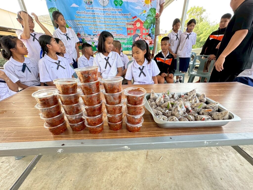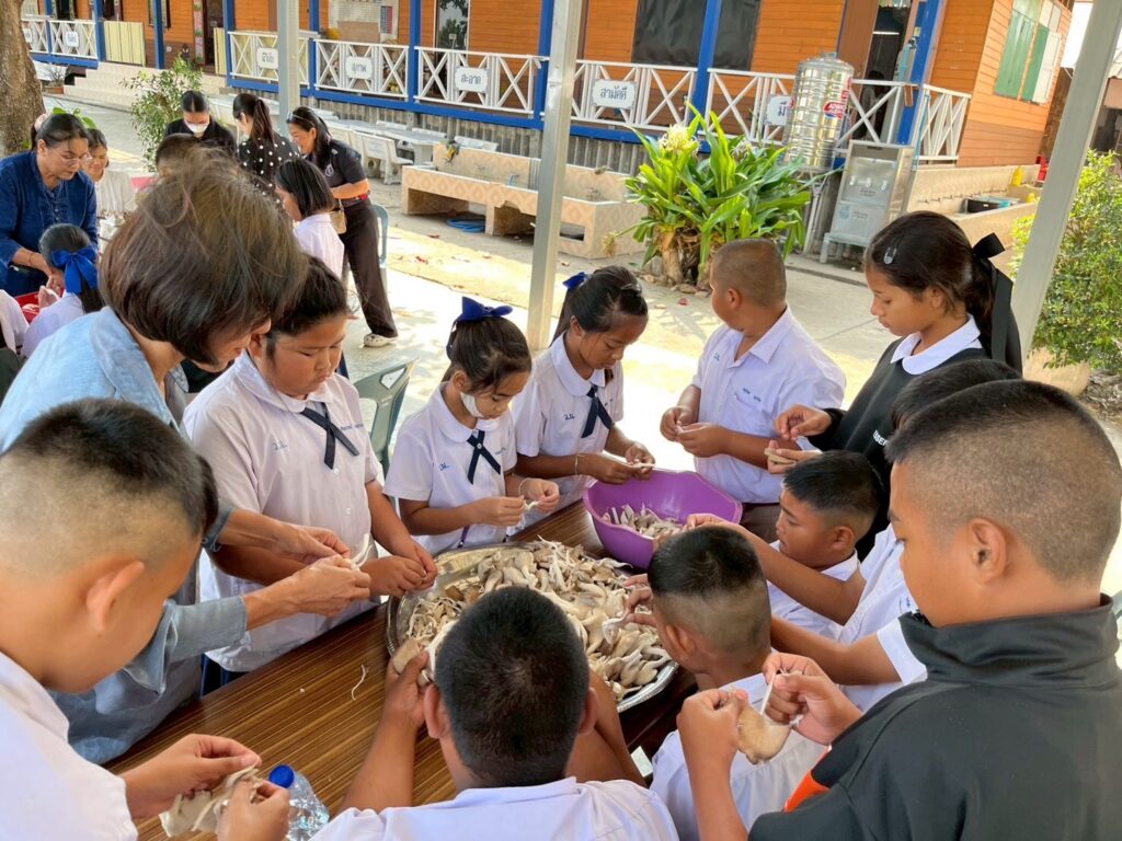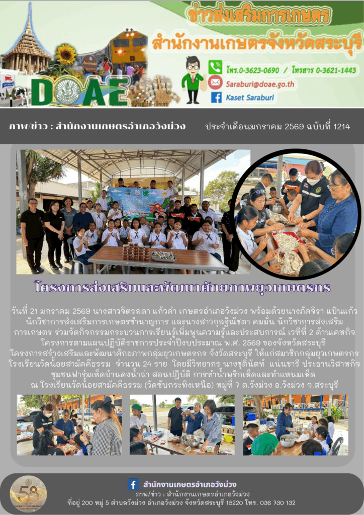 วันที่ 21 มกราคม 2569 นางสาวจิตรลดา แก้วคำ เกษตรอำเภอวังม่วง พร้อมด้วยนางภัคจิรา แป้นแก้ว นักวิชาการส่งเสริมการเกษตรชำนาญการ และนางสาวกุลฐิณัชตา คมมั่น นักวิชาการส่งเสริมการเกษตร ร่วมจัดกิจกรรมกระบวนการเรียนรู้เพิ่มพูนความรู้และประสบการณ์ เวทีที่ 2 ด้านเคหกิจ โครงการตามแผนปฏิบัติราชการประจำปีงบประมาณ พ.ศ. 2569 ของจังหวัดสระบุรี โครงการสร้างเสริมและพัฒนาศักยภาพกลุ่มยุวเกษตรกร จังวัดสระบุรี ให้แก่สมาชิกกลุ่มยุวเกษตรกรโรงเรียนวัดน้้อยสามัคคีธรรม จำนวน 24 ราย โดยมีวิทยากร นางชุตินัตท์ แน่นชารี ประธานวิสาหกิจชุมชนฟาร์มเห็ดบ้านดงน้ำฉ่า สอนปฎิบัติ การทำน้ำพริกเห็ดและทำแหนมเห็ด ณ โรงเรียนวัดน้้อยสามัคคีธรรม (วัดซับกระทิงเหนือ) หมู่ที่ 7 ต.วังม่วง อ.วังม่วง จ.สระบุรี