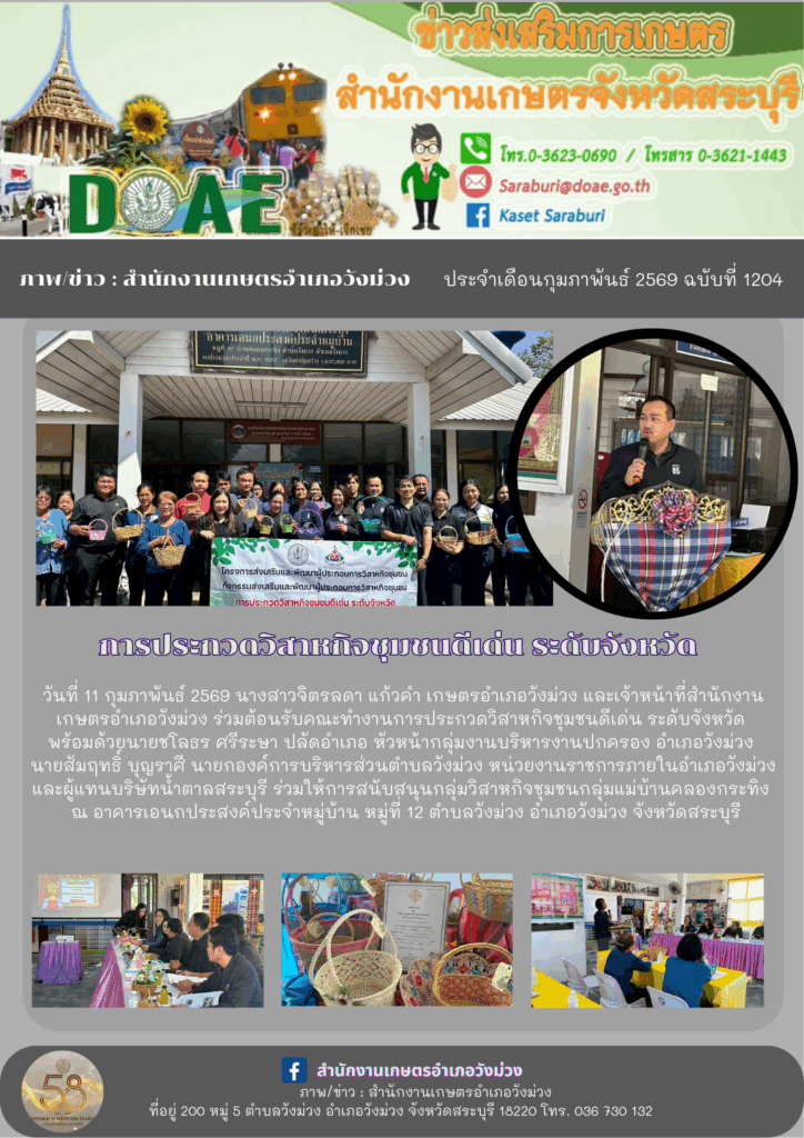 วันที่ 11 กุมภาพันธ์ 2569 นางสาวจิตรลดา แก้วคำ เกษตรอำเภอวังม่วง และเจ้าหน้าที่สำนักงานเกษตรอำเภอวังม่วง ร่วมต้อนรับคณะทำงานการประกวดวิสาหกิจชุมชนดีเด่น ระดับจังหวัด พร้อมด้วยนายชโลธร ศรีระษา ปลัดอำเภอ หัวหน้ากลุ่มงานบริหารงานปกครอง อำเภอวังม่วง นายสัมฤทธิ์ บุญราศี นายกองค์การบริหารส่วนตำบลวังม่วง หน่วยงานราชการภายในอำเภอวังม่วง และผู้แทนบริษัทน้ำตาลสระบุรี ร่วมให้การสนับสนุนกลุ่มวิสาหกิจชุมชนกลุ่มแม่บ้านคลองกระทิง ณ อาคารเอนกประสงค์ประจำหมู่บ้าน หมู่ที่ 12 ตำบลวังม่วง อำเภอวังม่วง จังหวัดสระบุรี