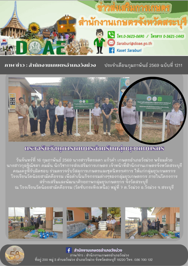 วันจันทร์ที่ 16 กุมภาพันธ์ 2569 นางสาวจิตรลดา แก้วคำ เกษตรอำเภอวังม่วง พร้อมด้วยนางสาวกุลฐิณัชตา คมมั่น นักวิชาการส่งเสริมการเกษตร เจ้าหน้าที่สำนักงานเกษตรจังหวัดสระบุรี คณะครูที่รับผิดชอบ ร่วมตรวจรับวัสดุการเกษตรและชุดนิทรรศการ ให้แก่กลุ่มยุวเกษตรกรโรงเรียนวัดน้อยสามัคคีธรรม เพื่อดำเนินกิจกรรมต่างๆของกลุ่มยุวเกษตรกร ภายในโครงการสร้างเสริมและพัฒนาศักยภาพกลุ่มยุวเกษตรกร จังวัดสระบุรี ณ โรงเรียนวัดน้อยสามัคคีธรรม (วัดซับกระทิงเหนือ) หมู่ที่ 7 ต.วังม่วง อ.วังม่วง จ.สระบุรี