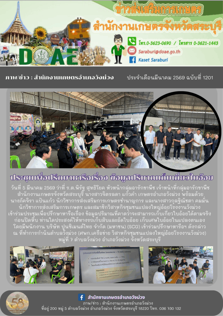 วันที่ 5 มีนาคม 2569 ว่าที่ ร.ต.พิรัฐ สุทธิโยค หัวหน้ากลุ่มอารักขาพืช เจ้าหน้าที่กลุ่มอารักขาพืช สำนักงานเกษตรจังหวัดสระบุรี นางสาวจิตรลดา แก้วคำ เกษตรอำเภอวังม่วง พร้อมด้วยนางภัคจิรา แป้นแก้ว นักวิชาการส่งเสริมการเกษตรชำนาญการ และนางสาวกุลฐิณัชตา คมมั่น นักวิชาการส่งเสริมการเกษตร และสมาชิกวิสาหกิจชุมชนแปลงใหญ่อ้อยโรงงานวังม่วง เข้าร่วมประชุมเพื่อปรึกษาหารือเรื่อง ข้อมูลปริมาณที่คาดว่าจะสามารถเก็บเกี่ยวใบอ้อยได้ตามจริง ก่อนปิดหีบ ท่านใดประสงค์ให้ทางรถเก็บสับและอัดใบอ้อย เก็บเศษใบอ้อยในแปลงตนเอง โดยมีพนักงาน บริษัท ปูนซิเมนต์ไทย จำกัด (มหาชน) (SCG) เข้าร่วมปรึกษาหารือฯ ดังกล่าว ณ ที่ทำการกำนันตำบลวังม่วง (ศพก.เครือข่าย วิสาหกิจชุมชนแปลงใหญ่อ้อยโรงงานวังม่วง) หมู่ที่ 7 ตำบลวังม่วง อำเภอวังม่วง จังหวัดสระบุรี