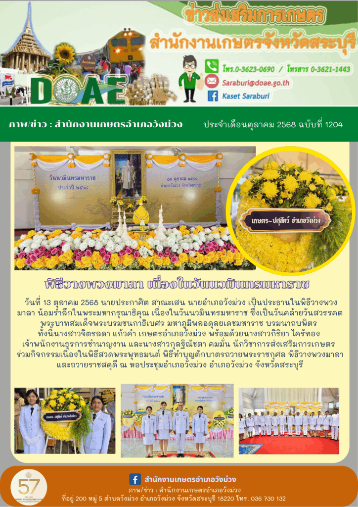 วันจันทร์ที่ 13 ตุลาคม 2568 เวลา 09.00 น. นายประกาศิต สาณะเสน นายอำเภอวังม่วง เป็นประธานในพิธีวางพวงมาลา น้อมรำลึกในพระมหากรุณาธิคุณ เนื่องในวันนวมินทรมหาราช 13 ตุลาคม 2568 ซึ่งเป็นวันคล้ายวันสวรรคตพระบาทสมเด็จพระบรมชนกาธิเบศร มหาภูมิพลอดุลยเดชมหาราช บรมนาถบพิตร โดยมีหัวหน้าส่วนราชการ ทหาร ตำรวจ นายกองค์กรปกครองส่วนท้องถิ่น ข้าราชการ รัฐวิสาหกิจ คณะกรรมการและสมาชิกกาชาดจังหวัดสระบุรี อำเภอวังม่วง กำนัน ผู้ใหญ่บ้าน ฯลฯ พนักงาน ลูกจ้าง สมาชิก อส. ภาคเอกชน และประชาชนชาวอำเภอวังม่วง ร่วมพิธีฯ ณ หอประชุมอำเภอวังม่วง