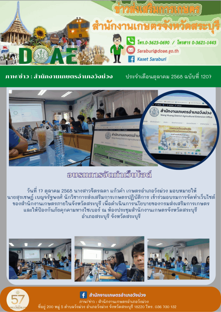 วันที่ 17 ตุลาคม 2568 นางสาวจิตรลดา แก้วคำ เกษตรอำเภอวังม่วง มอบหมายให้นายสุรเชษฎ์ เบญจรัฐพงศ์ นักวิชาการส่งเสริมการเกษตรปฏิบัติการ เข้าร่วมอบรมการจัดทำเว็บไซต์ของสำนักงานเกษตรภายในจังหวัดสระบุรี เพื่อดำเนินการนโยบายของกรมส่งเสริมการเกษตรและให้ป้องกันภัยคุกคามทางไซเบอร์ ณ ห้องประชุมสำนักงานเกษตรจังหวัดสระบุรี อำเภอสระบุรี จังหวัดสระบุรี