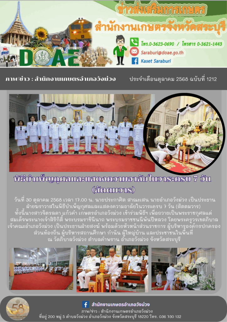 วันที่ 30 ตุลาคม 2568 เวลา 17.00 น. นายประกาศิต สาณะเสน นายอำเภอวังม่วง เป็นประธาน ฝ่ายฆราวาสในพิธีบำเพ็ญกุศลและแสดงความอาลัยในวาระครบ 7 วัน (สัตตมวาร) ทั้งนี้นางสาวจิตรลดา แก้วคำ เกษตรอำเภอวังม่วง เข้าร่วมพิธีฯ เพื่อถวายเป็นพระราชกุศลแด่ สมเด็จพระนางเจ้าสิริกิติ์ พระบรมราชินีนาถ พระบรมราชชนนีพันปีหลวง โดยพระครูวรเขตภิบาล เจ้าคณะอำเภอวังม่วง เป็นประธานฝ่ายสงฆ์ พร้อมด้วยหัวหน้าส่วนราชการ ผู้บริหารองค์กรปกครองส่วนท้องถิ่น ผู้บริหารสถานศึกษา กำนัน ผู้ใหญ่บ้าน และประชาชนในพื้นที่ ณ วัดภิบาลวังม่วง ตำบลคำพราน อำเภอวังม่วง จังหวัดสระบุรี