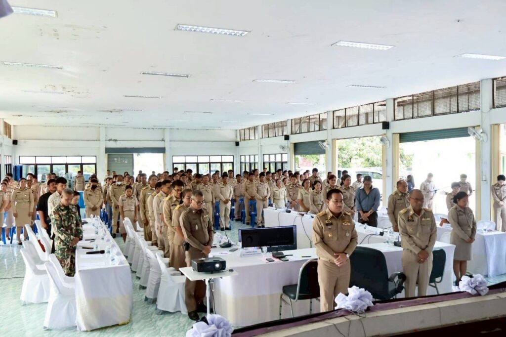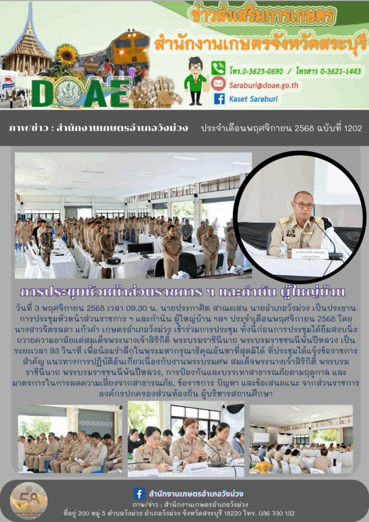 วันที่ 3 พฤศจิกายน 2568 เวลา 09.30 น. นายประกาศิต สาณะเสน นายอำเภอวังม่วง เป็นประธานการประชุมหัวหน้าส่วนราชการ ฯ และกำนัน ผู้ใหญ่บ้าน ฯลฯ ประจำเดือนพฤศจิกายน 2568 โดยนางสาวจิตรลดา แก้วคำ เกษตรอำเภอวังม่วง เข้าร่วมการประชุม ทั้งนี้ก่อนการประชุมได้ยืมสงบนิ่งถวายความอาลัยแด่สมเด็จพระนางเจ้าสิริกิติ์ พระบรมราชินีนาถ พระบรมราชชนนีพันปีหลวง เป็นระยะเวลา 93 วินาที เพื่อน้อมรำลึกในพระมหากรุณาธิคุณอันหาที่สุดมิได้ ที่ประชุมได้แจ้งข้อราชการสำคัญ แนวทางการปฏิบัติอันเกี่ยวเนื่องกับงานพระบรมศพ สมเด็จพระนางเจ้าสิริกิติ์ พระบรมราชินีนาถ พระบรมราชชนนีพันปีหลวง, การป้องกันและบรรเทาสาธารณภัยตามฤดูกาล และมาตรการในการลดความเสี่ยงจากสาธารณภัย, ข้อราชการ ปัญหา และข้อเสนอแนะ จากส่วนราชการ องค์กรปกครองส่วนท้องถิ่น ผู้บริหารสถานศึกษา