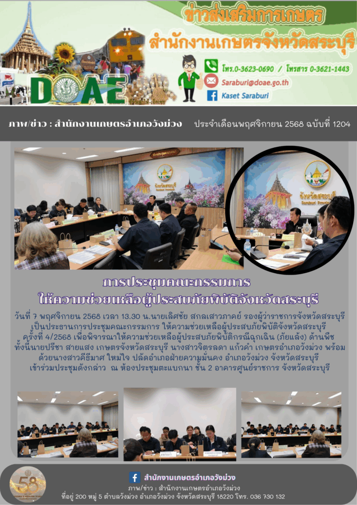 วันที่ 7 พฤศจิกายน 2568 เวลา 13.30 น.นายเลิศชัย สกลเสาวภาคย์ รองผู้ว่าราชการจังหวัดสระบุรี เป็นประธานการประชุมคณะกรรมการ ให้ความช่วยเหลือผู้ประสบภัยพิบัติจังหวัดสระบุรี ครั้งที่ 4/2568 เพื่อพิจารณาให้ความช่วยเหลือผู้ประสบภัยพิบัติกรณีฉุกเฉิน (ภัยแล้ง) ด้านพืช ทั้งนี้นายปรีชา สายแสง เกษตรจังหวัดสระบุรี นางสาวจิตรลดา แก้วคำ เกษตรอำเภอวังม่วง พร้อมด้วยนางสาวคีธีมาศ ใหม่ใจ ปลัดอำเภอฝ่ายความมั่นคง อำเภอวังม่วง จังหวัดสระบุรี เข้าร่วมประชุมดังกล่าว ณ ห้องประชุมตะแบกนา ชั้น 2 อาคารศูนย์ราชการ จังหวัดสระบุรี