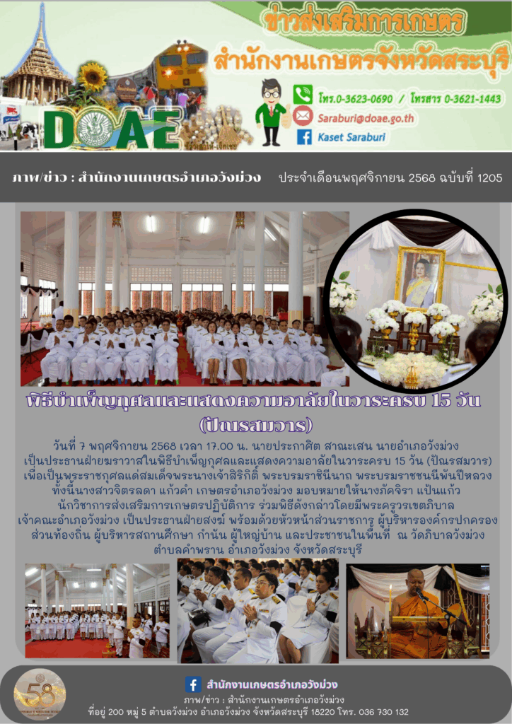 วันที่ 7 พฤศจิกายน 2568 เวลา 17.00 น. นายประกาศิต สาณะเสน นายอำเภอวังม่วง เป็นประธานฝ่ายฆราวาสในพิธีบำเพ็ญกุศลและแสดงความอาลัยในวาระครบ 15 วัน (ปัณรสมวาร) เพื่อเป็นพระราชกุศลแด่สมเด็จพระนางเจ้าสิริกิติ์ พระบรมราชินีนาถ พระบรมราชชนนีพันปีหลวง ทั้งนี้นางสาวจิตรลดา แก้วคำ เกษตรอำเภอวังม่วง มอบหมายให้นางภัคจิรา แป้นแก้ว นักวิชาการส่งเสริมการเกษตรปฏิบัติการ ร่วมพิธีดังกล่าวโดยมีพระครูวรเขตภิบาล เจ้าคณะอำเภอวังม่วง เป็นประธานฝ่ายสงฆ์ พร้อมด้วยหัวหน้าส่วนราชการ ผู้บริหารองค์กรปกครองส่วนท้องถิ่น ผู้บริหารสถานศึกษา กำนัน ผู้ใหญ่บ้าน และประชาชนในพื้นที่ ณ วัดภิบาลวังม่วง ตำบลคำพราน อำเภอวังม่วง จังหวัดสระบุรี