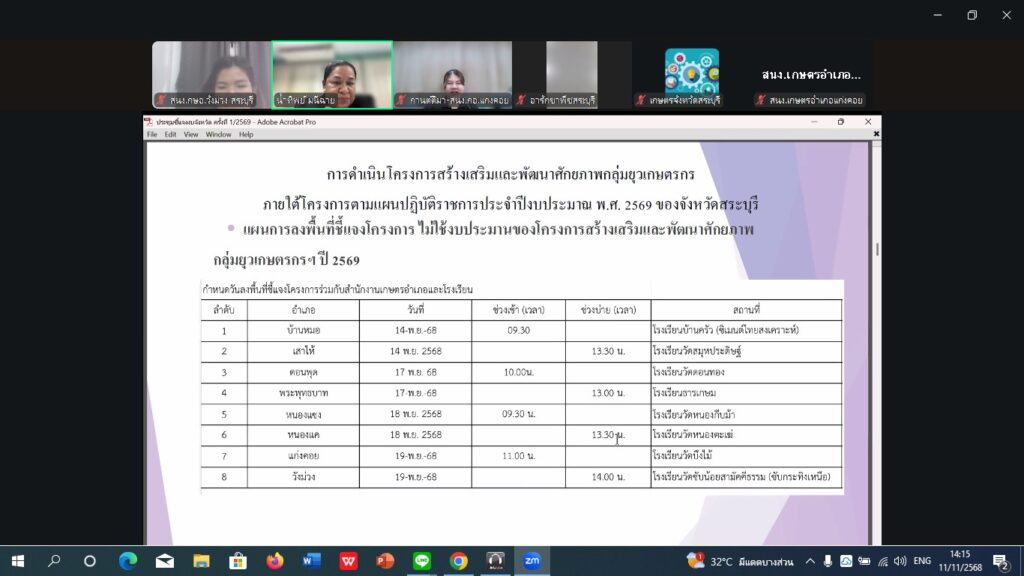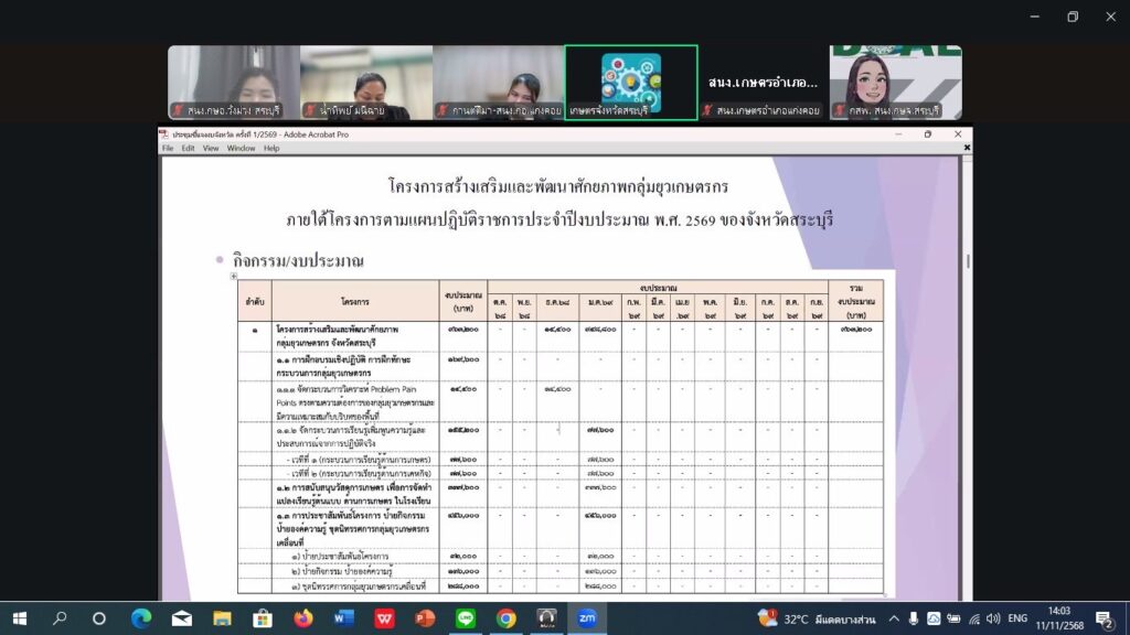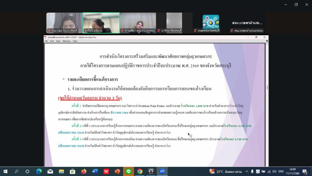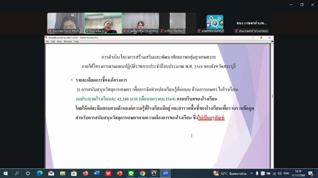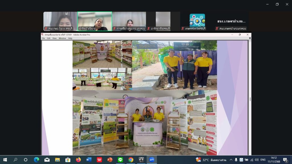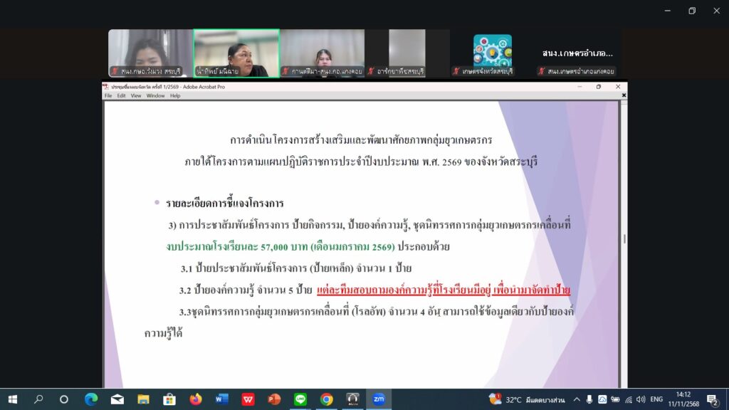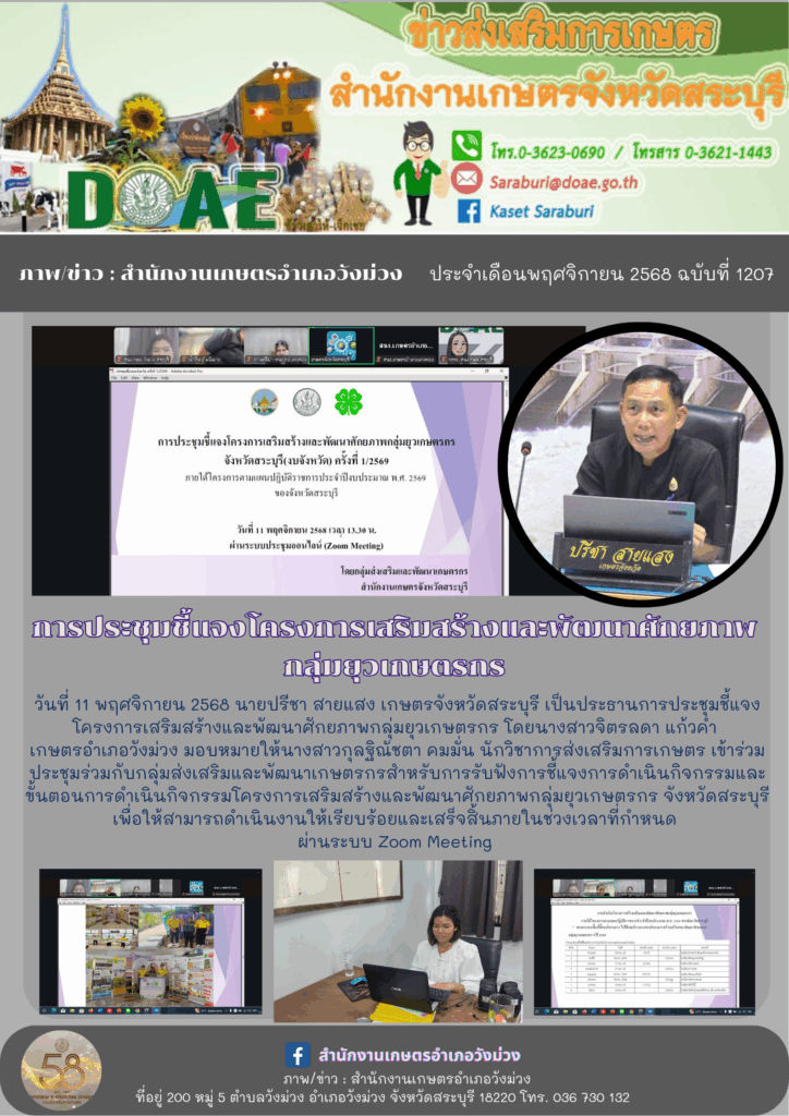 วันที่ 11 พฤศจิกายน 2568 นายปรีชา สายแสง เกษตรจังหวัดสระบุรี เป็นประธานการประชุมชี้แจงโครงการเสริมสร้างและพัฒนาศักยภาพกลุ่มยุวเกษตรกร โดยนางสาวจิตรลดา แก้วคำ เกษตรอำเภอวังม่วง มอบหมายให้นางสาวกุลฐิณัชตา คมมั่น นักวิชาการส่งเสริมการเกษตร เข้าร่วมประชุมร่วมกับกลุ่มส่งเสริมและพัฒนาเกษตรกรสำหรับการรับฟังการชี้แจงการดำเนินกิจกรรมและขั้นตอนการดำเนินกิจกรรมโครงการเสริมสร้างและพัฒนาศักยภาพกลุ่มยุวเกษตรกร จังหวัดสระบุรี เพื่อให้สามารถดำเนินงานให้เรียบร้อยและเสร็จสิ้นภายในช่วงเวลาที่กำหนด ผ่านระบบ Zoom Meeting
