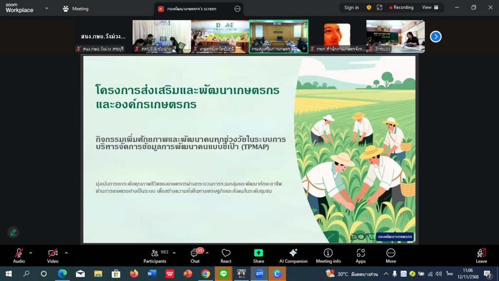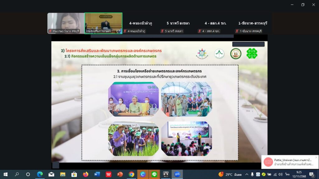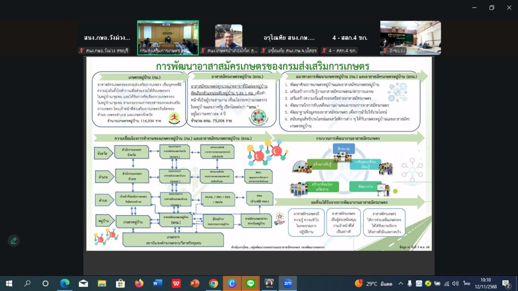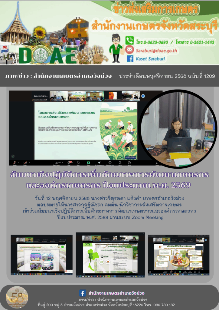 วันที่ 12 พฤศจิกายน 2568 นางสาวจิตรลดา แก้วคำ เกษตรอำเภอวังม่วง มอบหมายให้นางสาวกุลฐิณัชตา คมมั่น นักวิชาการส่งเสริมการเกษตร เข้าร่วมสัมมนาเชิงปฏิบัติการเพิ่มศักยภาพการพัฒนาเกษตรกรและองค์กรเกษตรกร ปีงบประมาณ พ.ศ. 2569 ผ่านระบบ Zoom Meeting