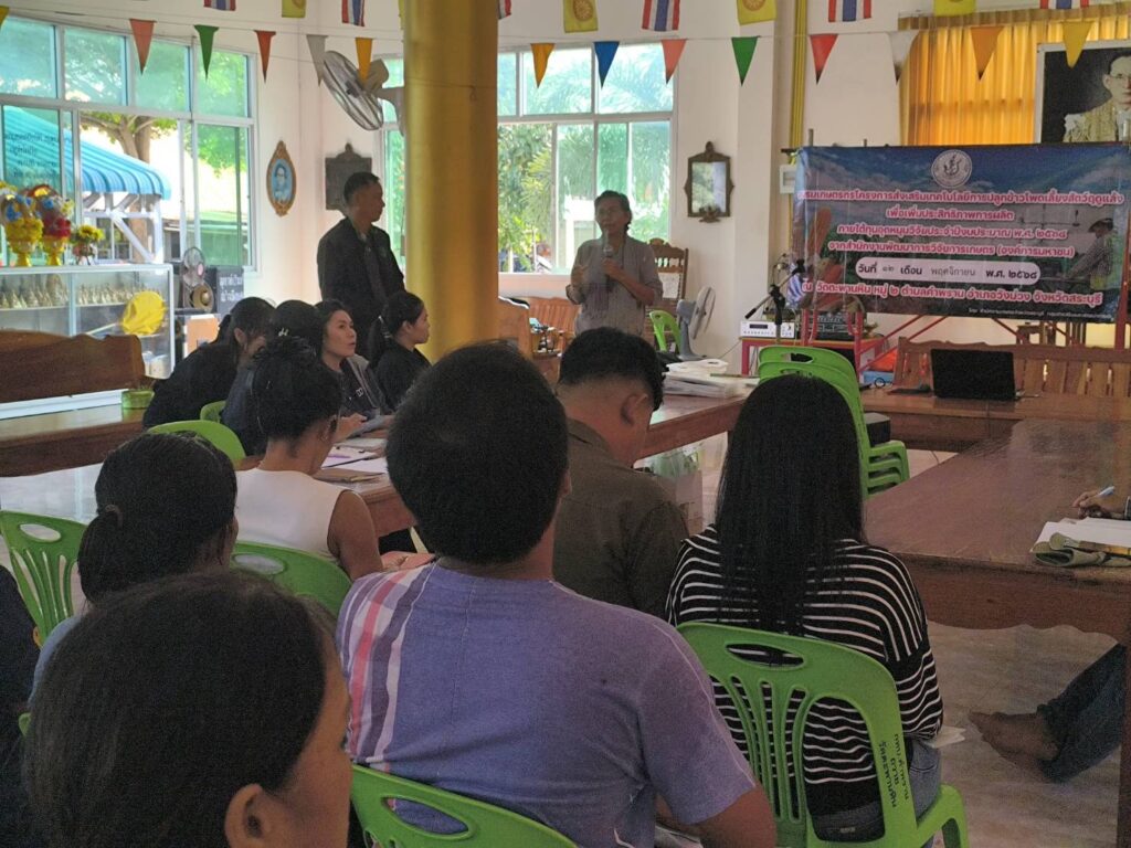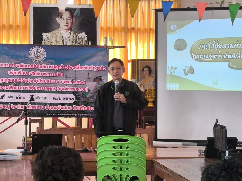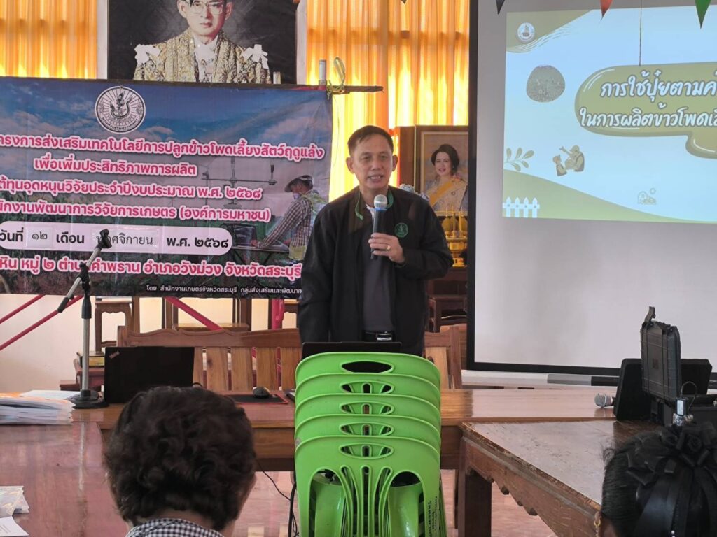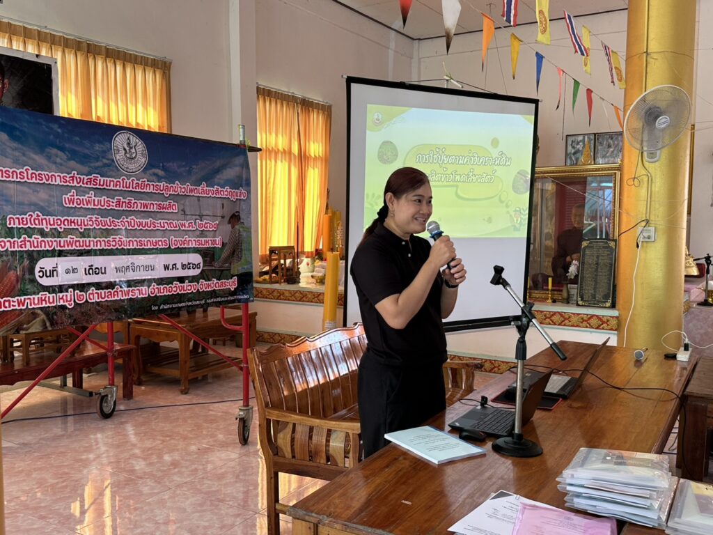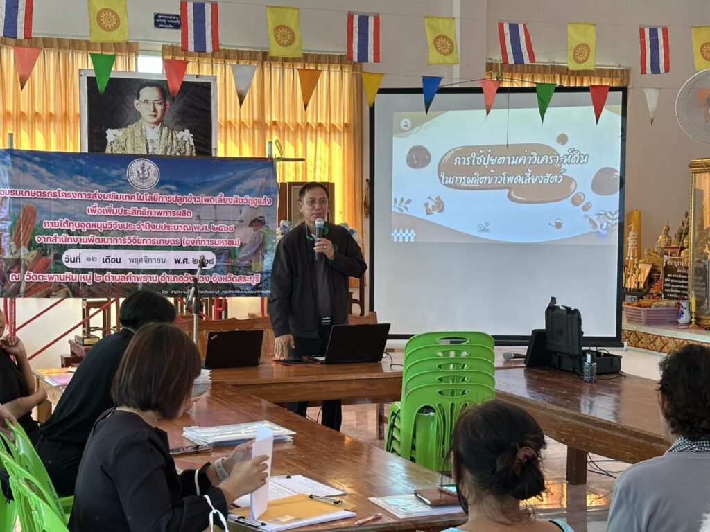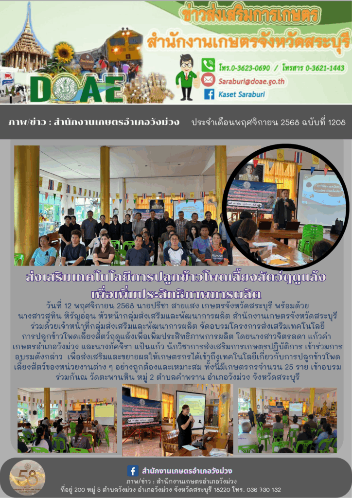 วันที่ 12 พฤศจิกายน 2568 นายปรีชา สายแสง เกษตรจังหวัดสระบุรี พร้อมด้วยนางสาวสุทิน หิรัญอ่อน หัวหน้ากลุ่มส่งเสริมและพัฒนาการผลิต สำนักงานเกษตรจังหวัดสระบุรี ร่วมด้วยเจ้าหน้าที่กลุ่มส่งเสริมและพัฒนาการผลิต จัดอบรมโครงการส่งเสริมเทคโนโลยีการปลูกข้าวโพดเลี้ยงสัตว์ฤดูแล้งเพื่อเพิ่มประสิทธิภาพการผลิต โดยนางสาวจิตรลดา แก้วคำ เกษตรอำเภอวังม่วง และนางภัคจิรา แป้นแก้ว นักวิชาการส่งเสริมการเกษตรปฏิบัติการ เข้าร่วมการอบรมดังกล่าว เพื่อส่งเสริมและขยายผลให้เกษตรกรได้เข้าถึงเทคโนโลยีเกี่ยวกับการปลูกข้าวโพดเลี้ยงสัตว์ของหน่วยงานต่าง ๆ อย่างถูกต้องและเหมาะสม ทั้งนี้มีเกษตรกรจำนวน 25 ราย เข้าอบรมร่วมกันณ วัดตะพานหิน หมู่ 2 ตำบลคำพราน อำเภอวังม่วง จังหวัดสระบุรี