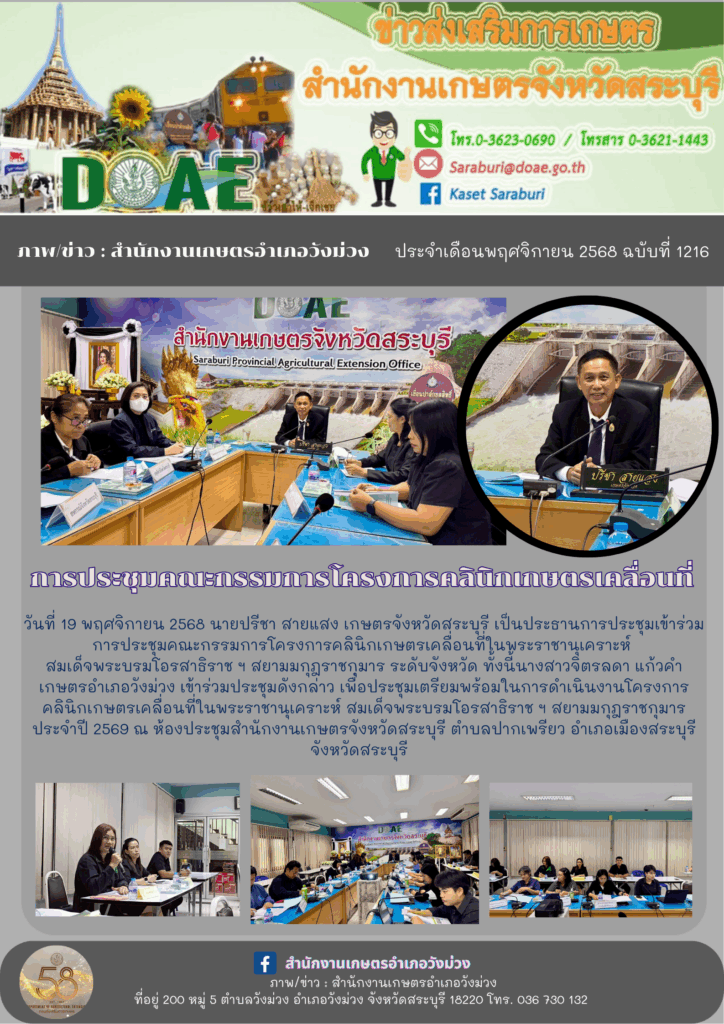 วันที่ 19 พฤศจิกายน 2568 นายปรีชา สายแสง เกษตรจังหวัดสระบุรี เป็นประธานการประชุมเข้าร่วมการประชุมคณะกรรมการโครงการคลินิกเกษตรเคลื่อนที่ในพระราชานุเคราะห์ สมเด็จพระบรมโอรสาธิราช ฯ สยามมกุฎราชกุมาร ระดับจังหวัด ทั้งนี้นางสาวจิตรลดา แก้วคำ เกษตรอำเภอวังม่วง เข้าร่วมประชุมดังกล่าว เพื่อประชุมเตรียมพร้อมในการดำเนินงานโครงการคลินิกเกษตรเคลื่อนที่ในพระราชานุเคราะห์ สมเด็จพระบรมโอรสาธิราช ฯ สยามมกุฎราชกุมาร ประจำปี 2569 ณ ห้องประชุมสำนักงานเกษตรจังหวัดสระบุรี ตำบลปากเพรียว อำเภอเมืองสระบุรี จังหวัดสระบุรี