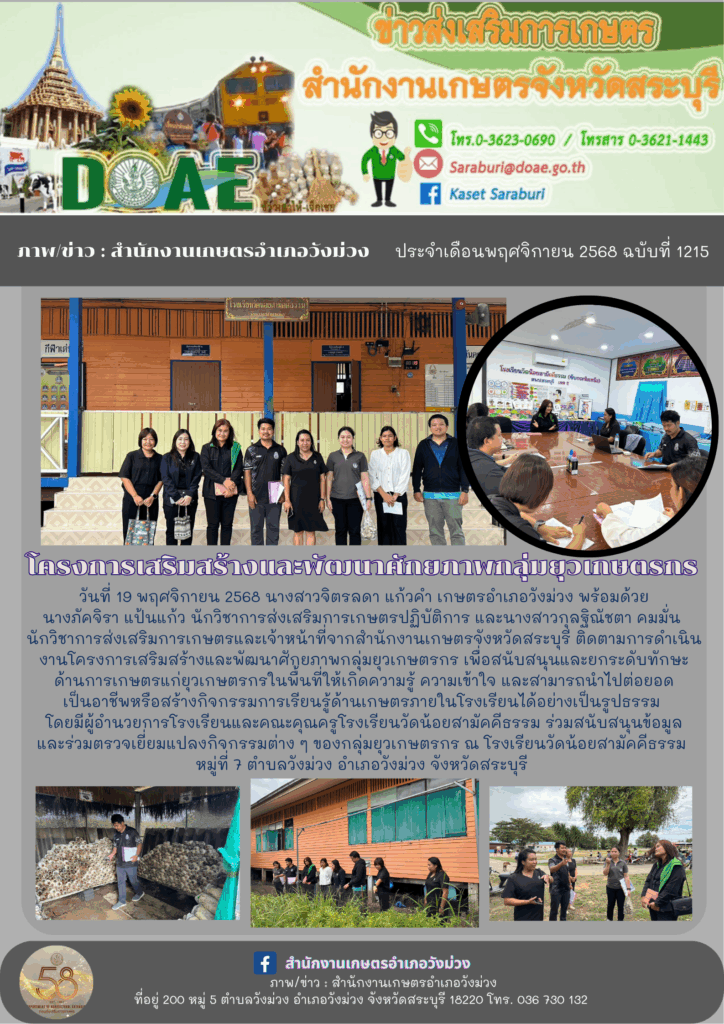 วันที่ 19 พฤศจิกายน 2568 นางสาวจิตรลดา แก้วคำ เกษตรอำเภอวังม่วง พร้อมด้วยนางภัคจิรา แป้นแก้ว นักวิชาการส่งเสริมการเกษตรปฏิบัติการ และนางสาวกุลฐิณัชตา คมมั่น นักวิชาการส่งเสริมการเกษตรและเจ้าหน้าที่จากสำนักงานเกษตรจังหวัดสระบุรี ติดตามการดำเนินงานโครงการเสริมสร้างและพัฒนาศักยภาพกลุ่มยุวเกษตรกร เพื่อสนับสนุนและยกระดับทักษะด้านการเกษตรแก่ยุวเกษตรกรในพื้นที่ให้เกิดความรู้ ความเข้าใจ และสามารถนำไปต่อยอดเป็นอาชีพหรือสร้างกิจกรรมการเรียนรู้ด้านเกษตรภายในโรงเรียนได้อย่างเป็นรูปธรรม โดยมีผู้อำนวยการโรงเรียนและคณะคุณครูโรงเรียนวัดน้อยสามัคคีธรรม ร่วมสนับสนุนข้อมูลและร่วมตรวจเยี่ยมแปลงกิจกรรมต่าง ๆ ของกลุ่มยุวเกษตรกร ณ โรงเรียนวัดน้อยสามัคคีธรรม หมู่ที่ 7 ตำบลวังม่วง อำเภอวังม่วง จังหวัดสระบุรี