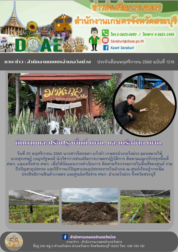 วันที่ 25 พฤศจิกายน 2568 นางสาวจิตรลดา แก้วคำ เกษตรอำเภอวังม่วง มอบหมายให้นายสุรเชษฎ์ เบญจรัฐพงศ์ นักวิชาการส่งเสริมการเกษตรปฏิบัติการ ติดตามและปรังปรุงพื้นที่ ศพก. และเครือข่าย ศพก. เพื่อให้จัดแผนการดำเนินการ ติดตามกิจกรรมภายในพื้นที่ของศูนย์ รวมถึงปัญหาอุปสรรค และวิธีการแก้ปัญหาและอุปสรรคภายในอำเภอ ณ ศูนย์เรียนรู้การเพิ่มประสิทธิภาพสินค้าเกษตร และศูนย์เครือข่าย ศพก. อำเภอวังม่วง จังหวัดสระบุรี