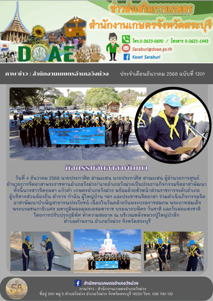 วันที่ 4 ธันวาคม 2568 นายประกาศิต สาณะเสน นายประกาศิต สาณะเสน ผู้อำนวยการศูนย์อำนวยการจิตอาสาพระราชทานอำเภอวังม่วง/นายอำเภอวังม่วงเป็นประธานกิจกรรมจิตอาสาพัฒนา ทั้งนี้นางสาวจิตรลดา แก้วคำ เกษตรอำเภอวังม่วง พร้อมด้วยหัวหน้าส่วนราชการระดับอำเภอ ผู้บริหารส่วนท้องถิ่น ตำรวจ กำนัน ผู้ใหญ่บ้าน ฯลฯ และประชาชนจิตอาสา ร่วมดำเนินกิจกรรมจิตอาสาพัฒนาบำเพ็ญสาธารณประโยชน์ เนื่องในวันคล้ายวันพระบรมราชสมภพ พระบาทสมเด็จพระบรมชนกาธิเบศร มหาภูมิพลอดุลยเดชมหาราช บรมนาถบพิตร วันชาติ และวันพ่อแห่งชาติ โดยการปรับปรุงภูมิทัศ ทำความสะอาด ณ บริเวณหลังหลวงปู่ใหญ่ป่าสัก ตำบลคำพราน อำเภอวังม่วง จังหวัดสระบุรี