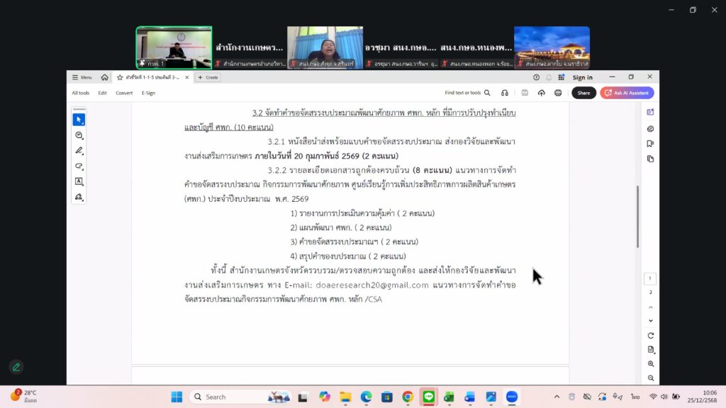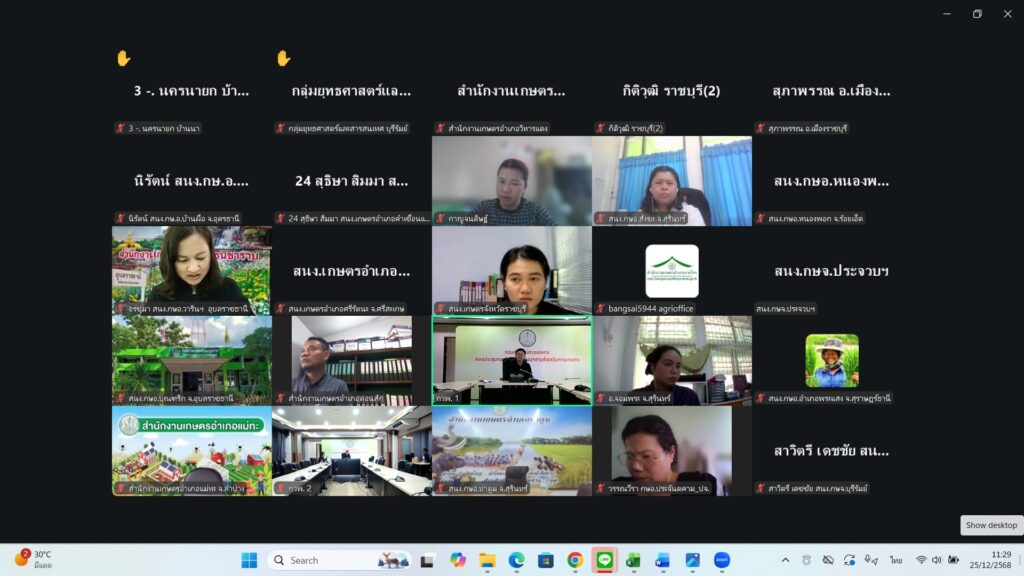 วันที่ 25 ธันวาคม 2568 นายบัณฑิต ผลวาวแวว นักวิชาการส่งเสริมการเกษตรชำนาญการ รักษาราชการแทนเกษตรอำเภอวิหารแดง มอบหมายให้นายอนุวัฒน์ คงสว่าง นักวิชาการส่งเสริมการเกษตรชำนาญการ เข้าร่วมประชุมชี้แจงแนวทางการทางการจัดทำตัวชี้วัดประเด็นกรอบการพัฒนาการเกษตรเชิงพื้นที่ ปี 2569 และประเด็นพัฒนาศักยภาพ ศพก. เพื่อรับฟังคำชี้แจงแนวทางการจัดทำตัวชี้วัดฯ ผ่านระบบ Zoom Meeting ณ สำนักงานเกษตรอำเภอวิหารแดง ตำบลหนองสรวง อำเภอวิหารแดง จังหวัดสระบุรี