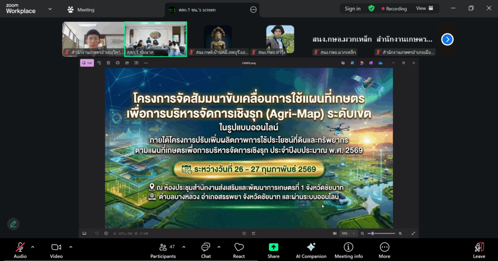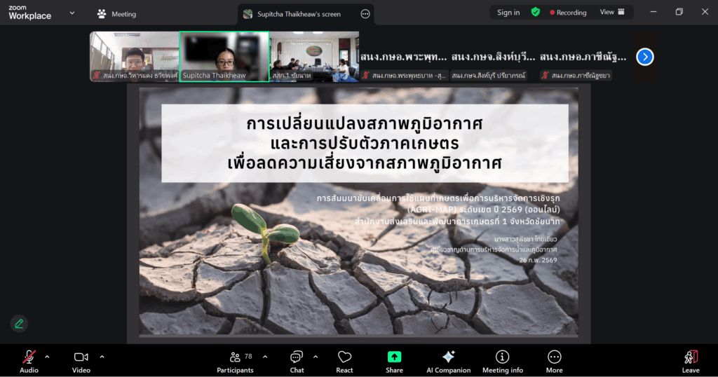 ระหว่างวันที่ 26-27 กุมภาพันธ์ 2569 นายบัณฑิต ผลวาวแวว นักวิชาการส่งเสริมการเกษตรชำนาญการ รักษาราชการแทนเกษตรอำเภอวิหารแดง มอบหมายให้ นายธวัชพงศ์ อาจเอี่ยม นักวิชาการส่งเสริมการเกษตรปฏิบัติการ เข้าร่วมสัมมนาขับเคลื่อนการใช้แผนที่เกษตรเพื่อการบริหารจัดการเชิงรุก (Agri-Map) ระดับเขต ประจำปีงบประมาณ พ.ศ. 2569 เพื่อพัฒนาเจ้าหน้าที่ในการประยุกต์ใช้ประโยชน์จากแผนที่เกษตรเพื่อบริหารจัดการเชิงรุก (Agri-Map) ในการดำเนินงานส่งเสริมการเกษตรในพื้นที่ ผ่านระบบออนไลน์ Zoom Meeting โดยมี นายวินัย นาคปาน ผู้อำนวยการกลุ่มส่งเสริมและพัฒนาการผลิต สำนักงานส่งเสริมและพัฒนาการเกษตรที่ 1 จังหวัดชัยนาท เป็นประธานในพิธีเปิดการสัมมนาฯ ณ สำนักงานเกษตรอำเภอวิหารแดง ตำบลหนองสรวง อำเภอวิหารแดง จังหวัดสระบุรี