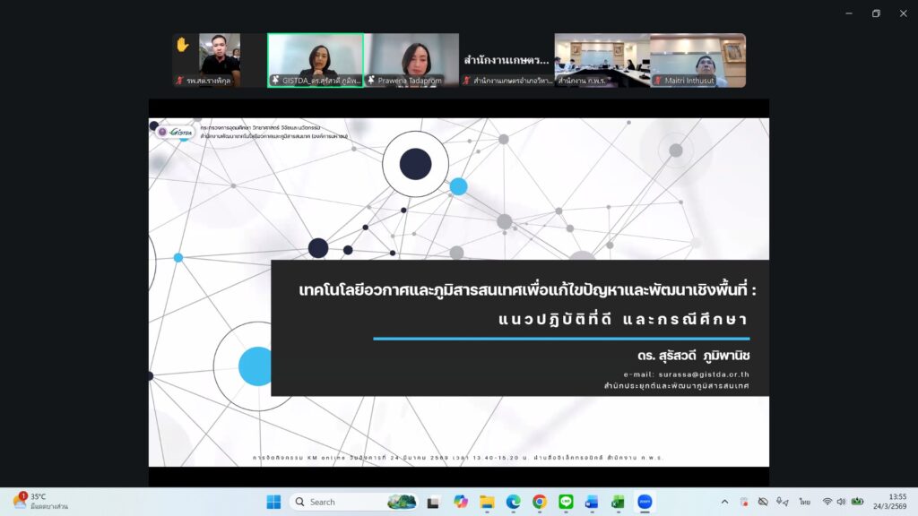 วันที่ 24 มีนาคม 2569 เวลา 13.30 น. นายบัณฑิต ผลวาวแวว นักวิชาการส่งเสริมการเกษตรชำนาญการ รักษาราชการแทนเกษตรอำเภอวิหารแดง มอบหมายให้นายอนุวัฒน์ คงสว่าง นักวิชาการส่งเสริมการเกษตรชำนาญการ เข้าร่วมกิจกรรม KM Online หัวข้อ “การใช้เทคโนโลยีอวกาศและภูมิสารสนเทศเพื่อแก้ไขปัญหาและพัฒนาเชิงพื้นที่ (จังหวัด อำเภอ และ อปท.) : แนวทางปฏิบัติที่ดี และกรณีศึกษา” ผ่านสื่ออิเล็กทรอนิกส์ (Zoom และ Youtube Live สำนักงาน ก.พ.ร.) เพื่อสามารถการนำความรู้ไปใช้ในการปฏิบัติงานเกี่ยวกับการส่งเสริมการเกษตรในพื้นที่และวัตถุประสงค์ของงานต่อไป ณ สำนักงานเกษตรอำเภอวิหารแดง ตำบลหนองสรวง อำเภอวิหารแดงจังหวัดสระบุรี