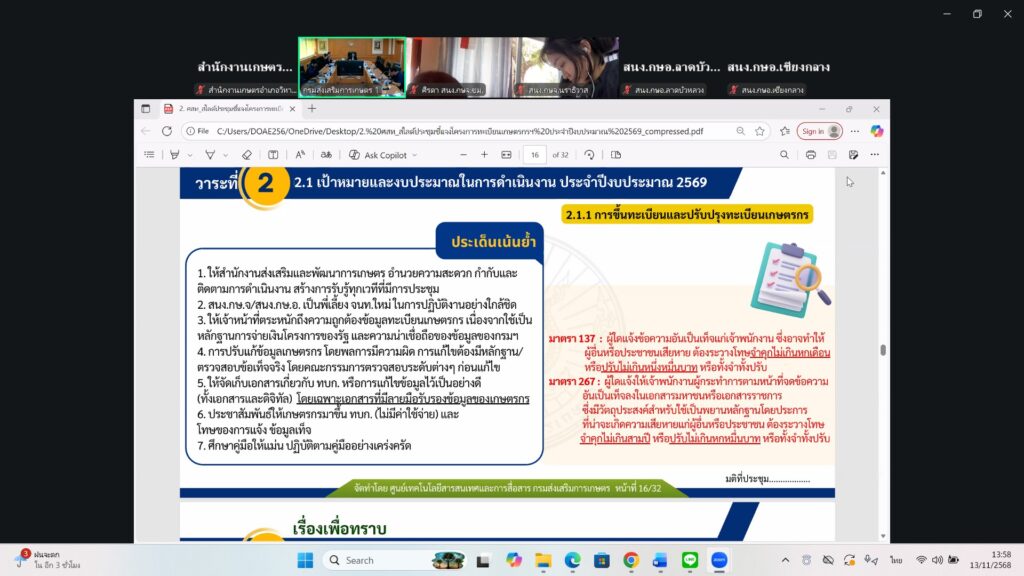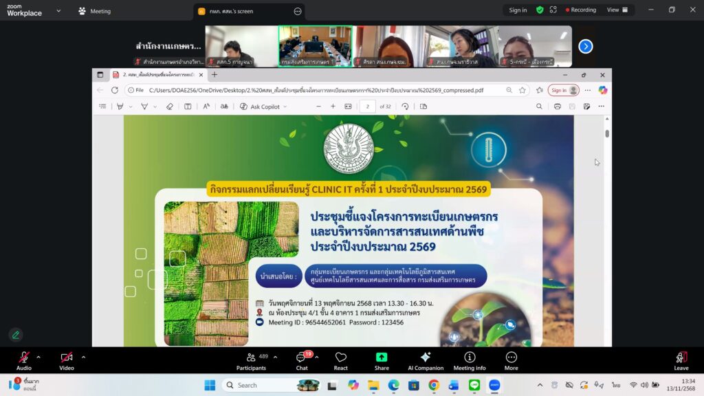 วันที่ 13 พฤศจิกายน 2568 นายบัณฑิต ผลวาวแวว นักวิชาการส่งเสริมการเกษตรชำนาญการ รักษาราชการแทนเกษตรอำเภอวิหารแดง พร้อมด้วย นายธวัชพงศ์ อาจเอี่ยม นักวิชาการส่งเสริมการเกษตรปฏิบัติการ เข้าร่วมรับฟังการชี้แจงโครงการขึ้นทะเบียนเกษตรกรและบริหารการจัดการสารสนเทศด้านพืช ประจำปีงบประมาณ 2569 ผ่านระบบออนไลน์ Zoom Meeting โดยมีนายครองศักดิ์ สงรักษา รองอธิบดีกรมส่งเสริมการเกษตร เป็นประธานฯ ณ สำนักงานเกษตรอำเภอวิหารแดง ตำบลหนองสรวง อำเภอวิหารแดง จังหวัดสระบุรี เพื่อชี้แจงการดำเนินงานการขึ้นทะเบียนและปรับปรุงทะเบียนเกษตรกร และการจัดทำผังแปลงเกษตรกรรมดิจิทัล